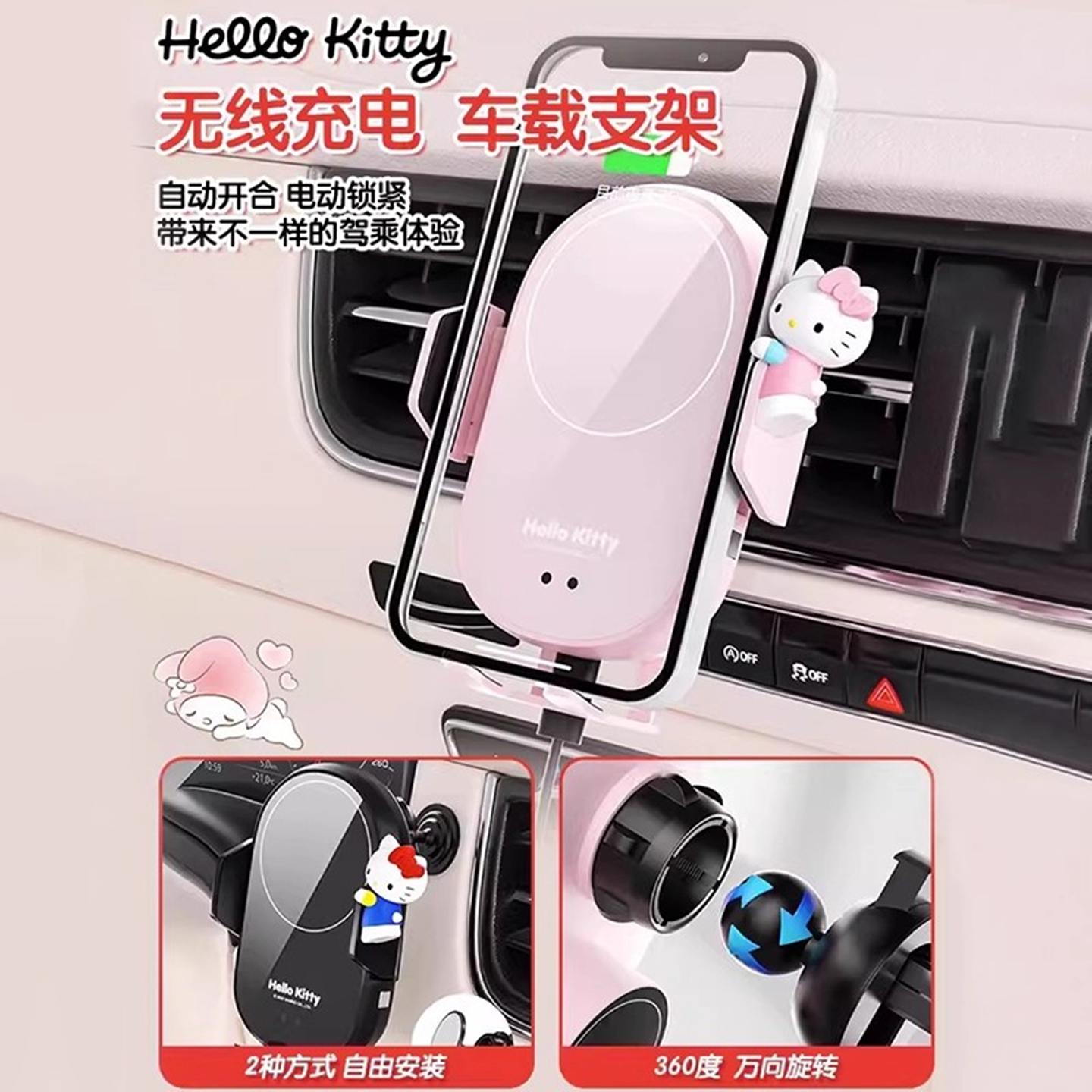 hellokitty手机车载支架汽车内用装饰无线充电器可爱2025女生新款