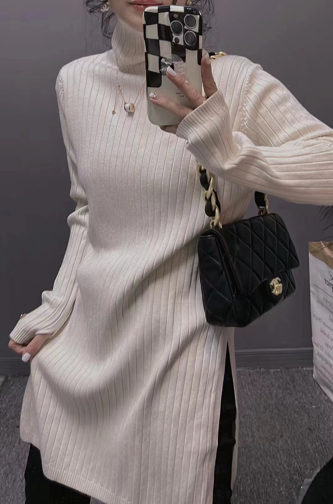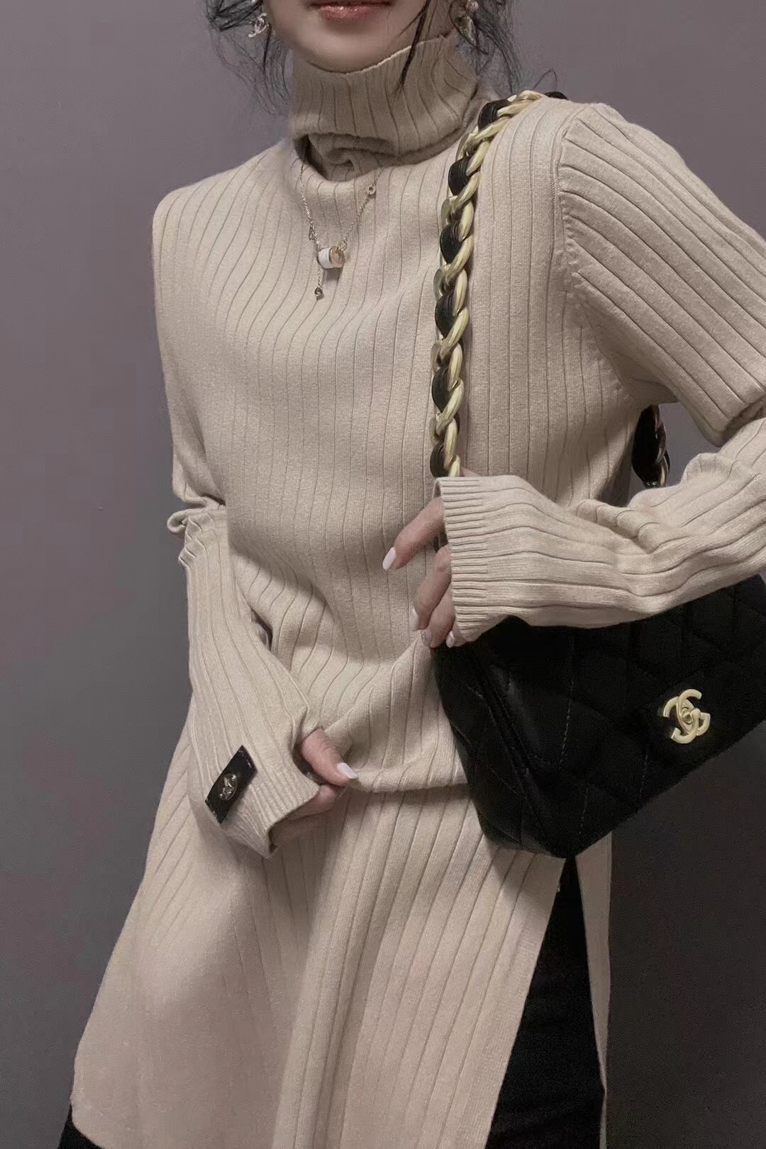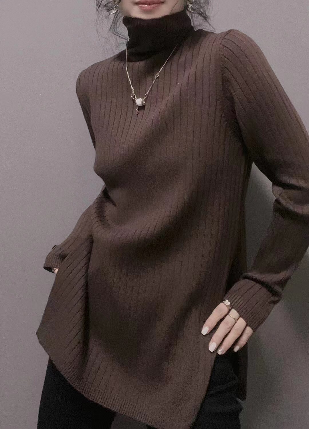衣唯硕7727中长款高领开叉羊绒棉长袖针织打底衫女