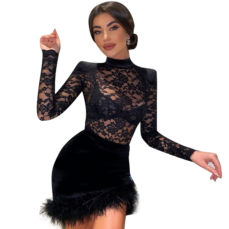 lace Patchwork See through dress蕾丝拼接绒面毛毛透视辣妹短裙
