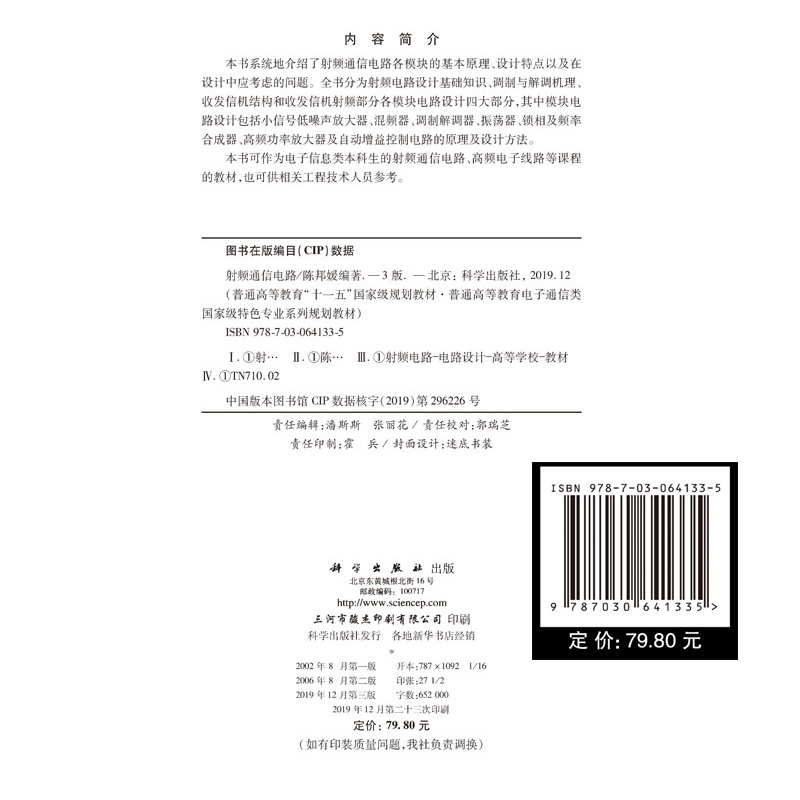 正版现货 射频通信电路第三版3 普通高等教育十一五国家级规划教材 陈邦媛 科学出版社