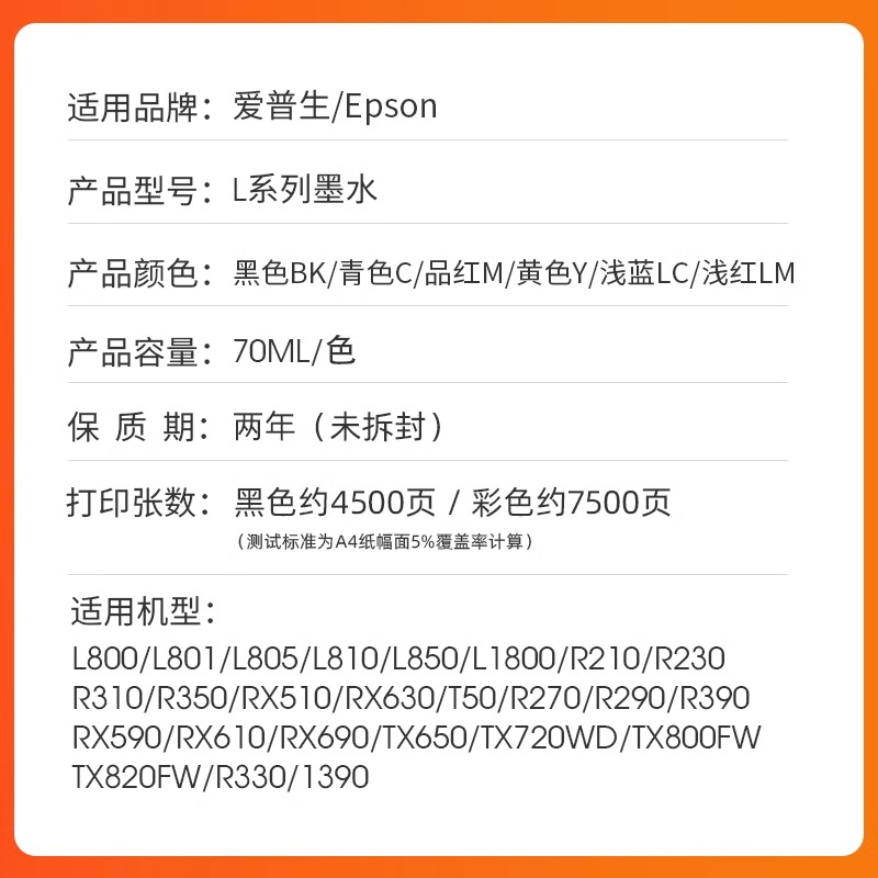 您的位置:他他商城  >  文体  >  适用EPSON爱普生674墨水L805 L1800 L801 L810 L850 L310 L360 L380 L383 R330黑彩色t50 1390 R230打印机672