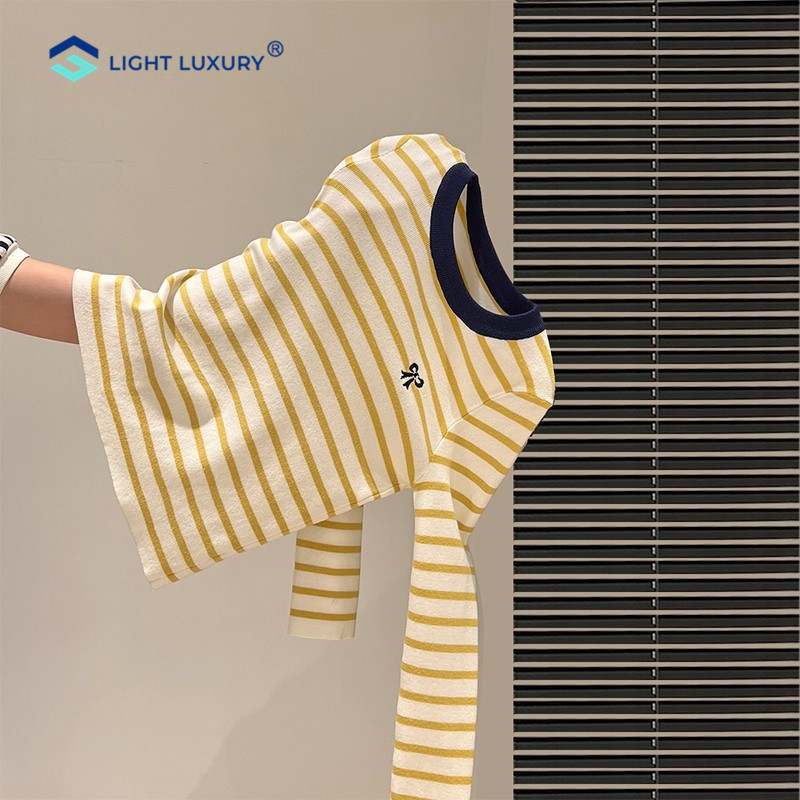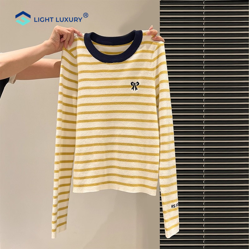您的位置:他他商城  >   >  撞色条纹T恤女黄色多巴胺修身显瘦内搭打底衫蝴蝶结设计长袖上衣
