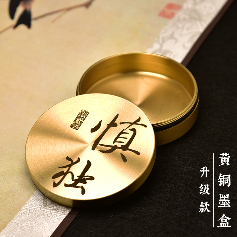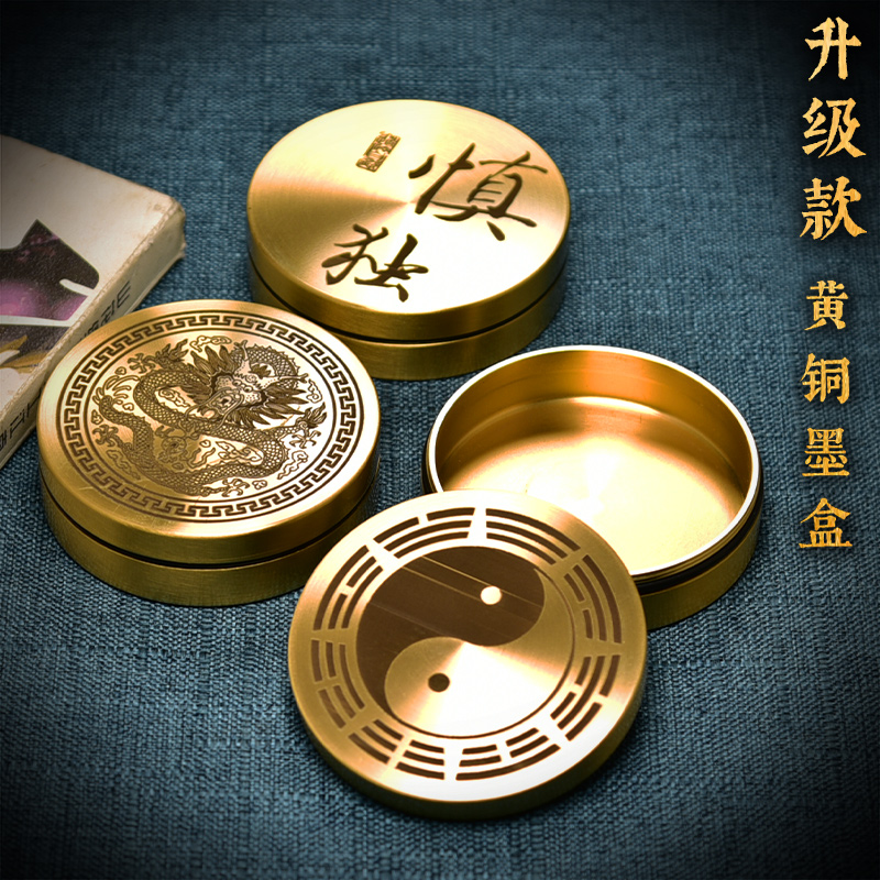 您的位置:他他商城  >   >  书法保湿墨盒黄铜文房四宝雕刻圆铜墨盒学生砚台歙砚毛笔带盖书法