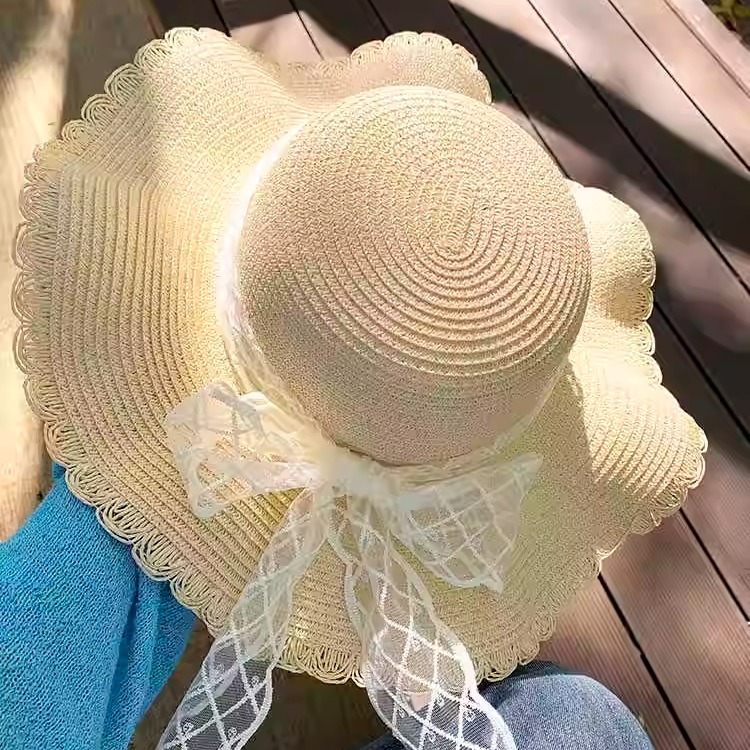蝴蝶结蕾丝草帽女夏天海边沙滩大帽檐度假风防晒遮阳草编太阳帽子 - 恋夏帽子潮流