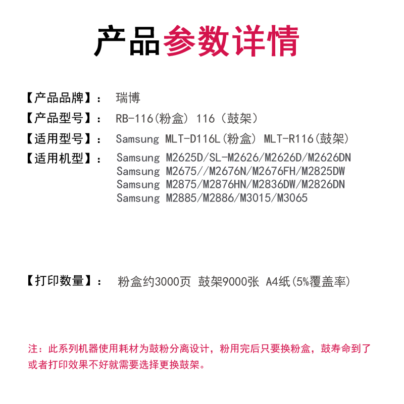 瑞博适用三星MLT-D116S D116L粉盒R116鼓架SL-m2626d/dn m2676n/fh m2876hn m2675f M2836DW打印机硒鼓墨粉盒 - 瑞博旗舰店