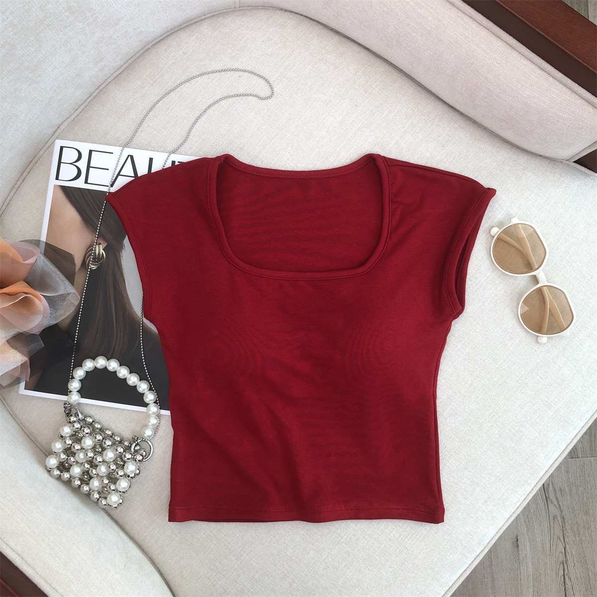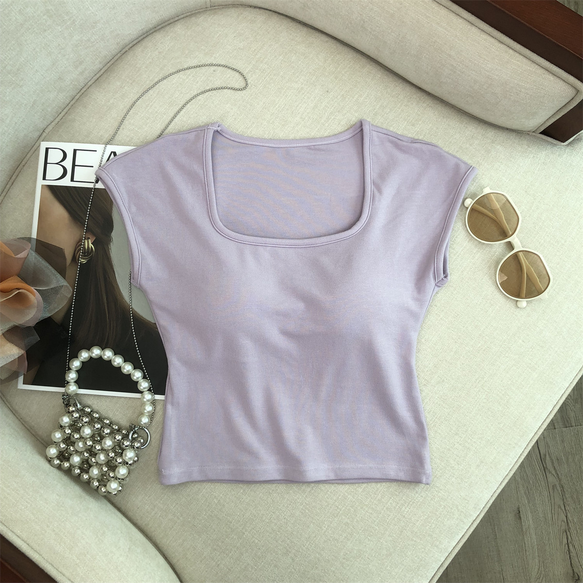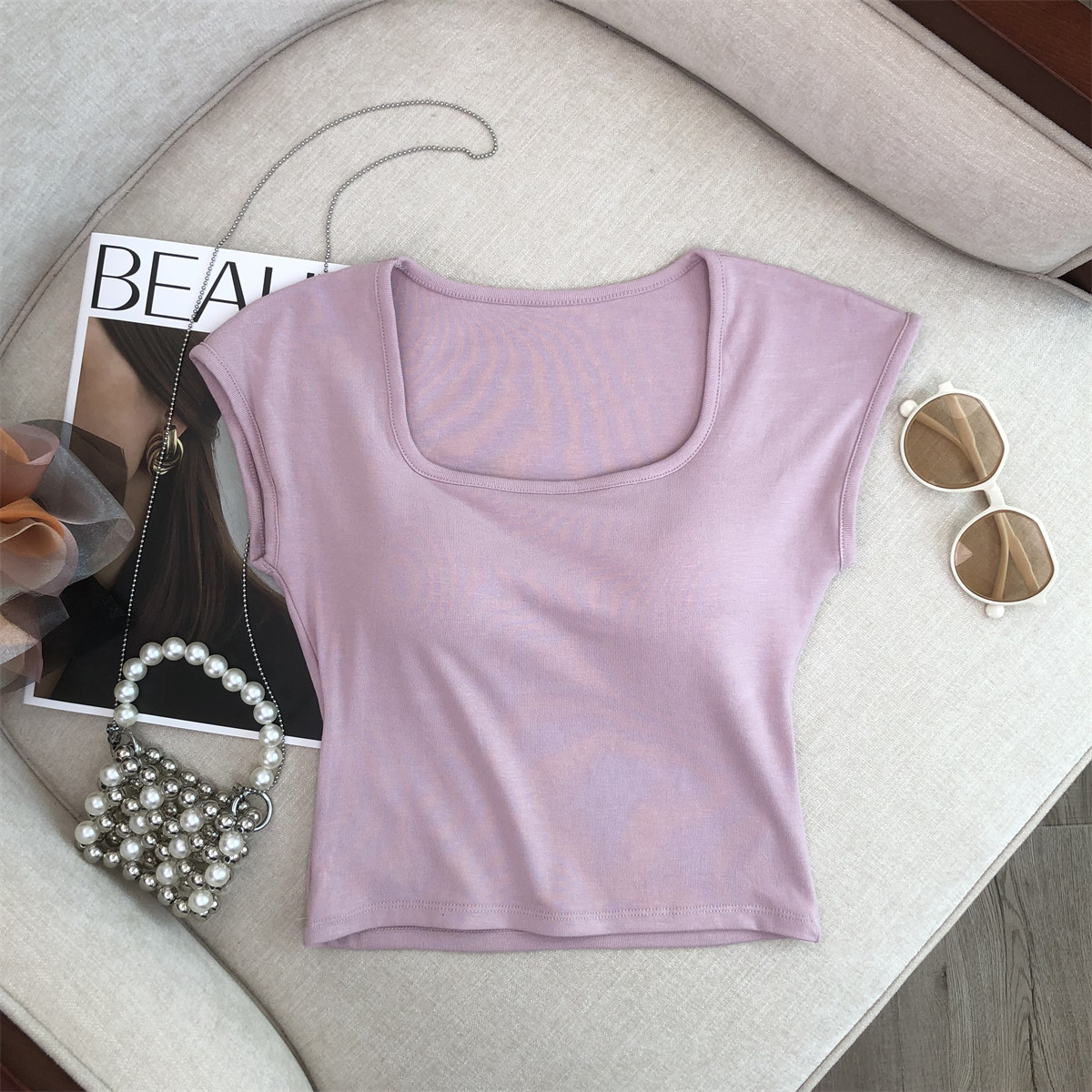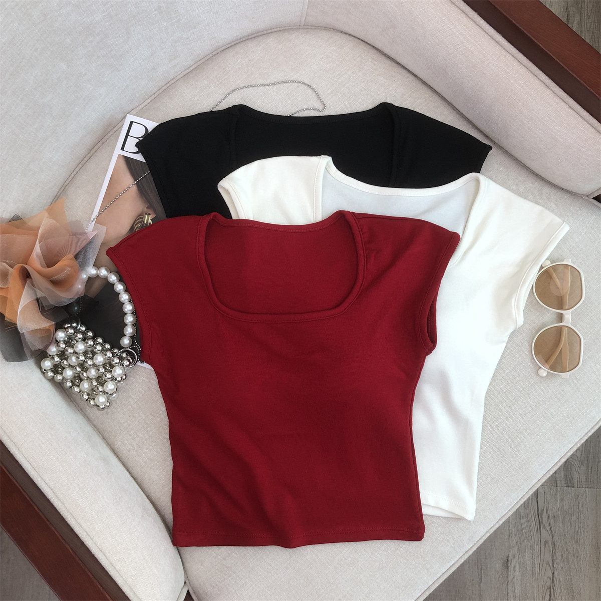2024新款方领短袖t恤女夏季辣妹修身打底别致绝美短款带胸垫上衣 - 瑞丽坊官方企业店