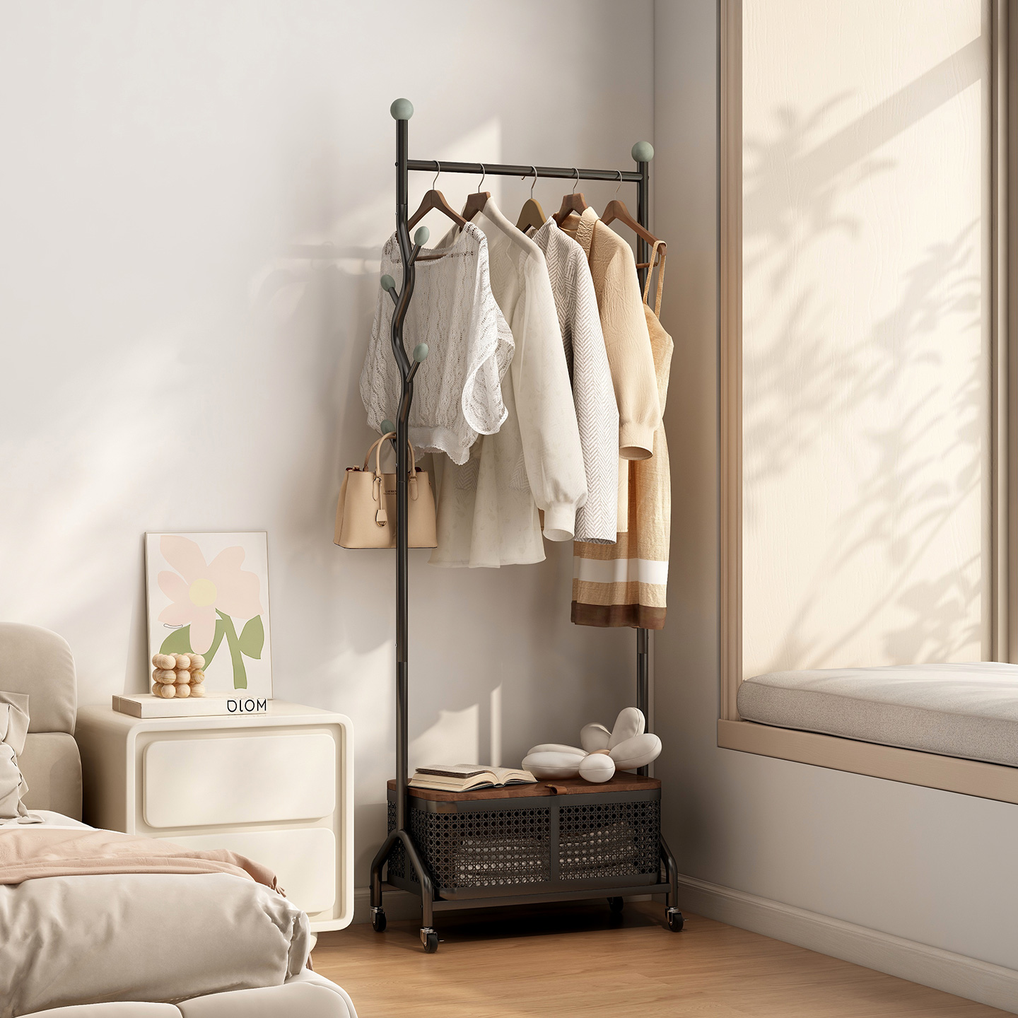 衣架卧室落地简易挂衣架家用客厅衣服收纳架子奶油风可移动衣帽架 - 速立普旗舰店