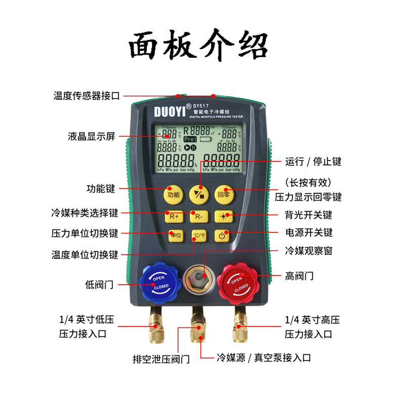 您的位置:他他商城  >   >  多一汽车空调加氟真空压力表DY517A加液充氟制冷维修电子冷媒表组