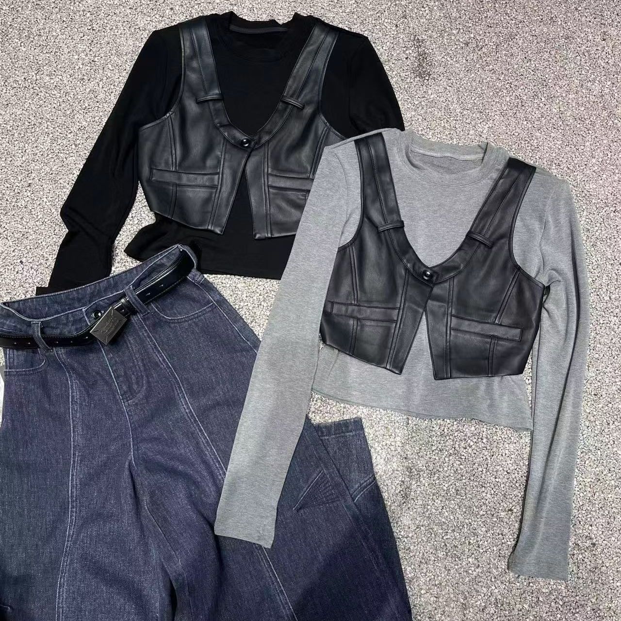 LIAN里安2025秋冬新款韩版时尚设计感小众拼接蛋白皮假两件小衫女