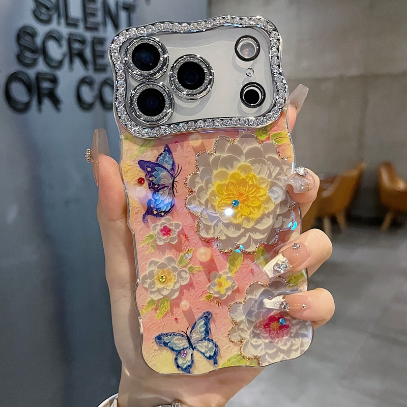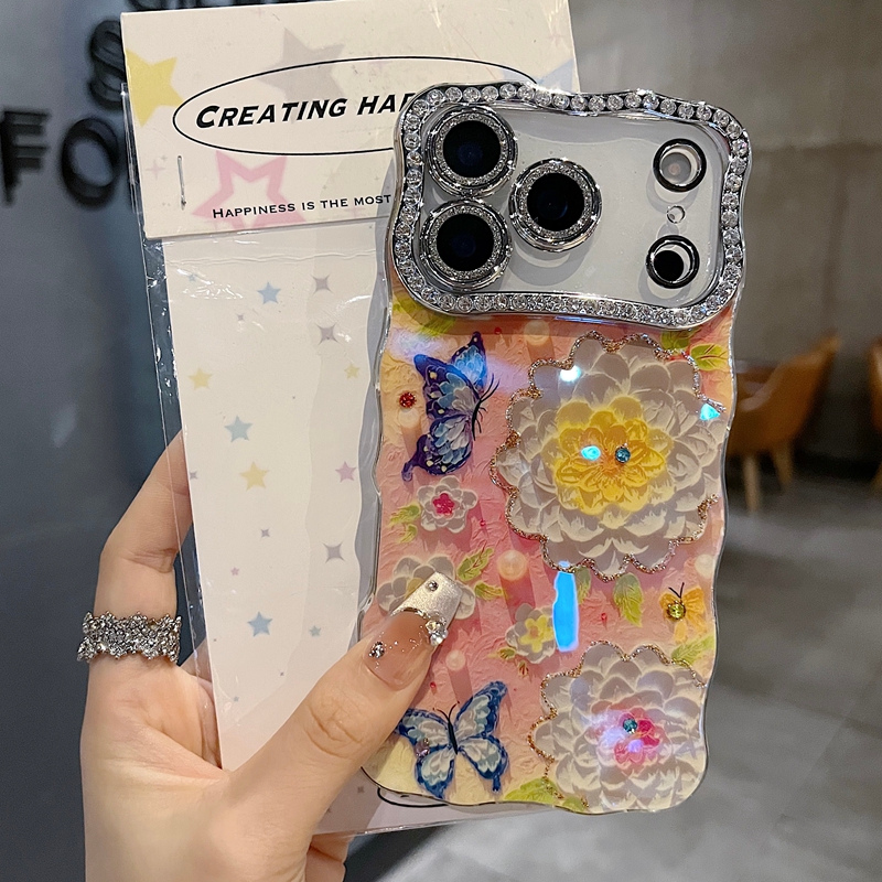 适用苹果系列iPhone17新款手机壳14promax16promax小清新山茶花蝴蝶15promax全包满钻精孔镜框扭边网红保护套 - 壳小二的壳