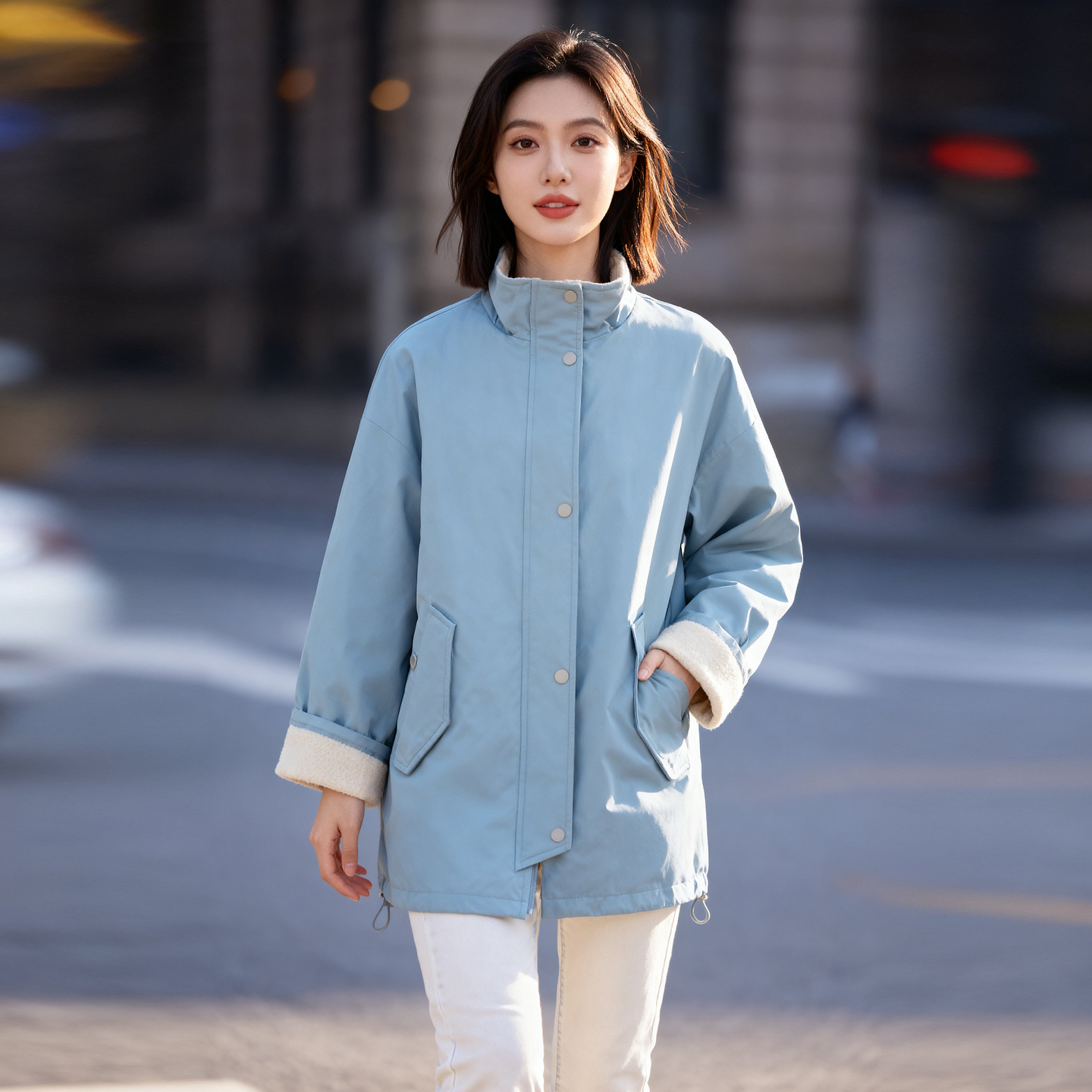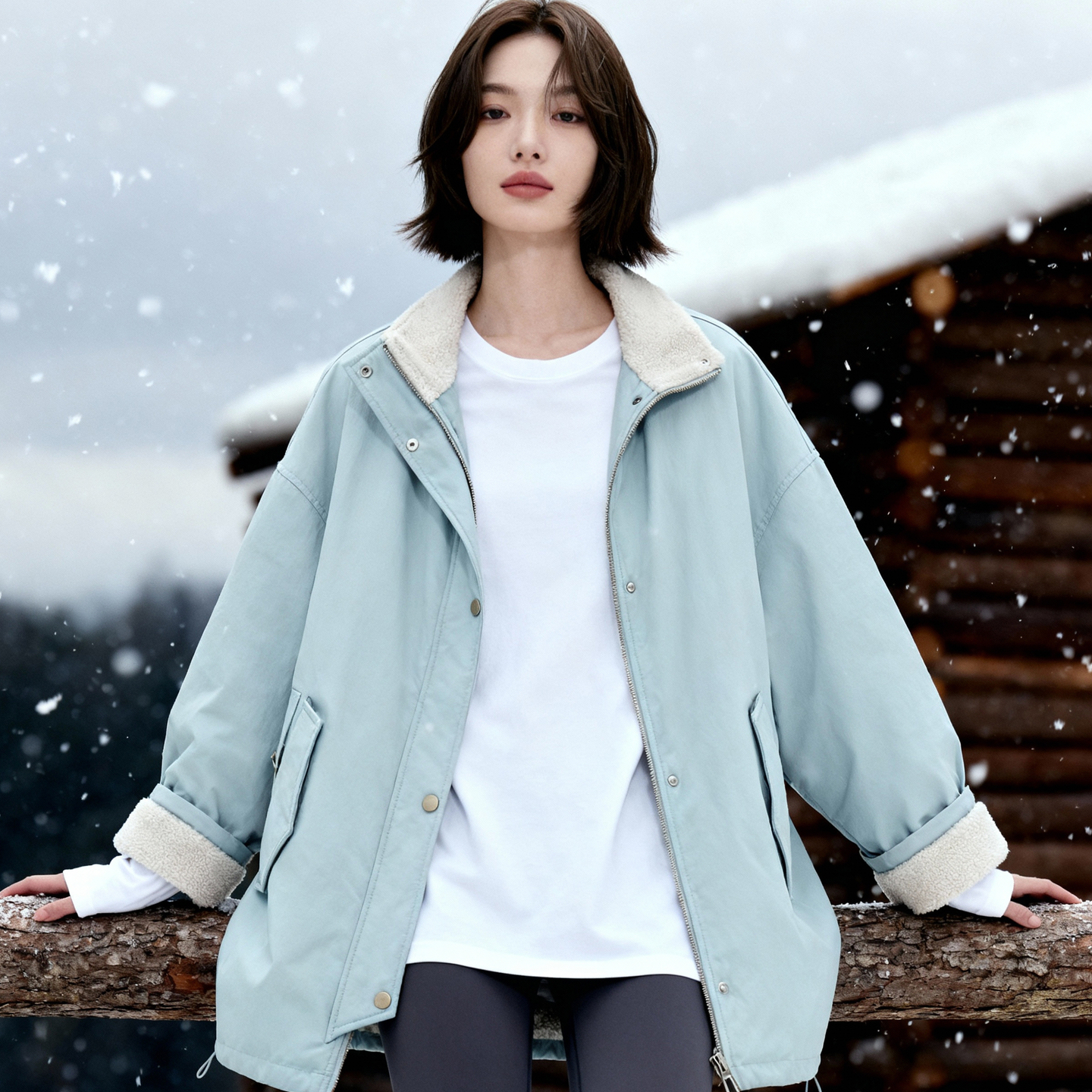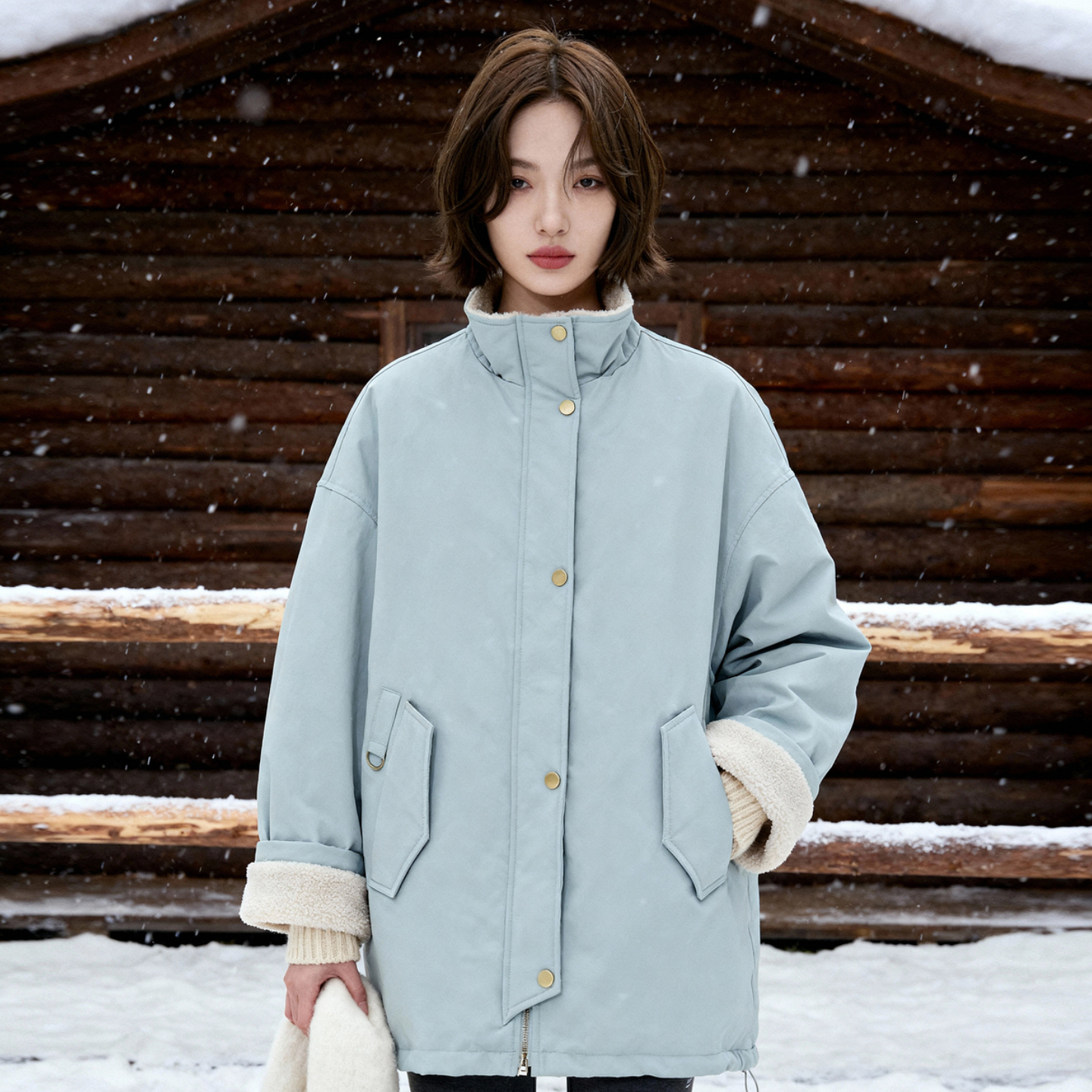 Basic House/百家好拼接羊羔毛派克服女中长款宽松工装风棉服外套 - BASICHOUSE女装旗舰店