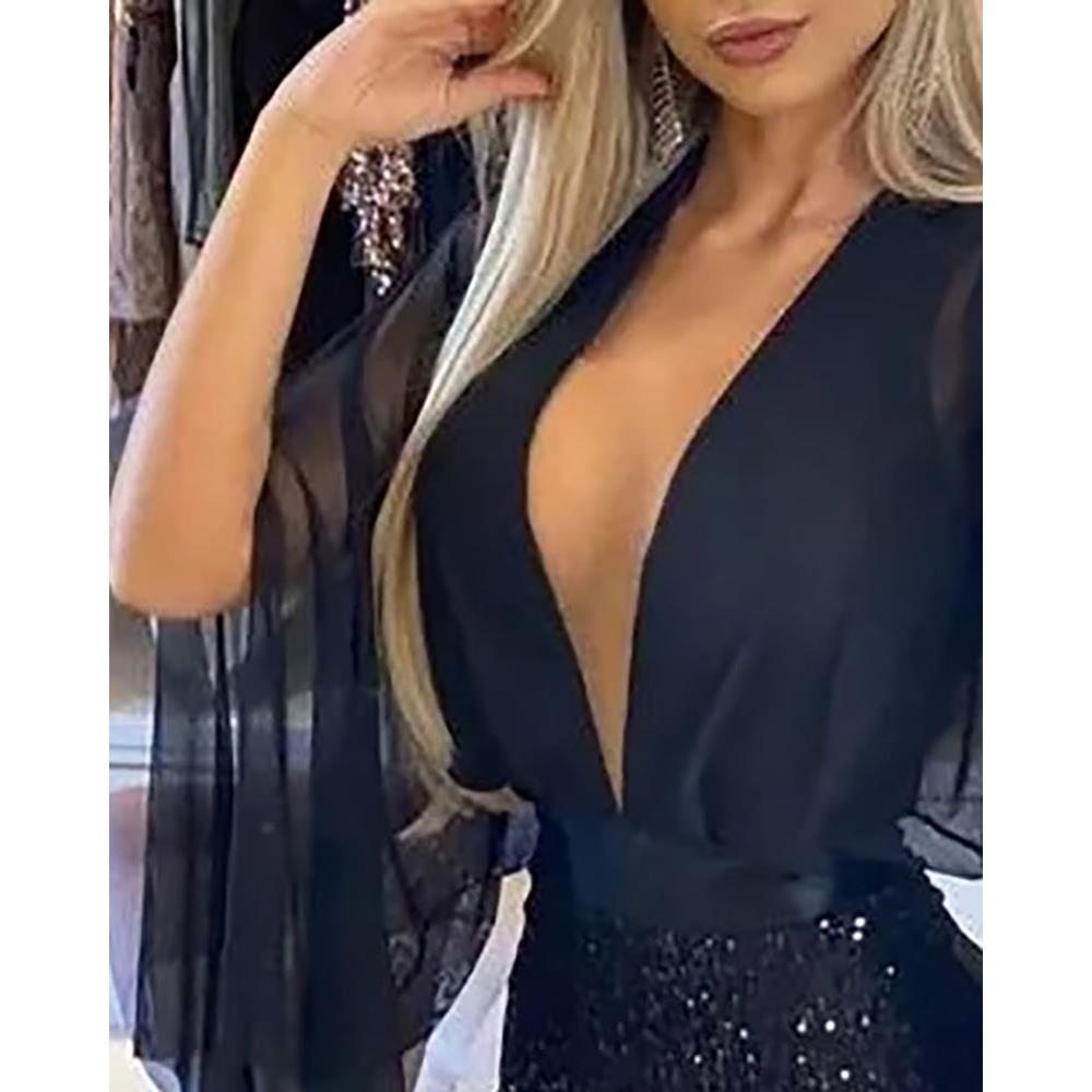 Sheer Mesh Sequins Skinny RompersV领网纱拼接珠片开衩连体裤
