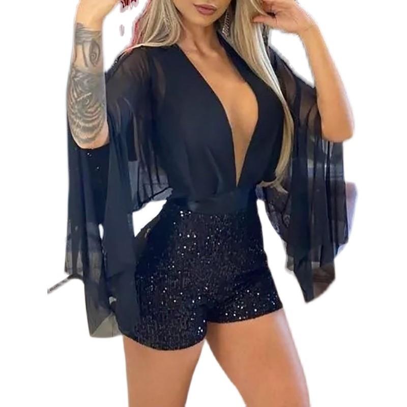 Sheer Mesh Sequins Skinny RompersV领网纱拼接珠片开衩连体裤 - d[s392105959]