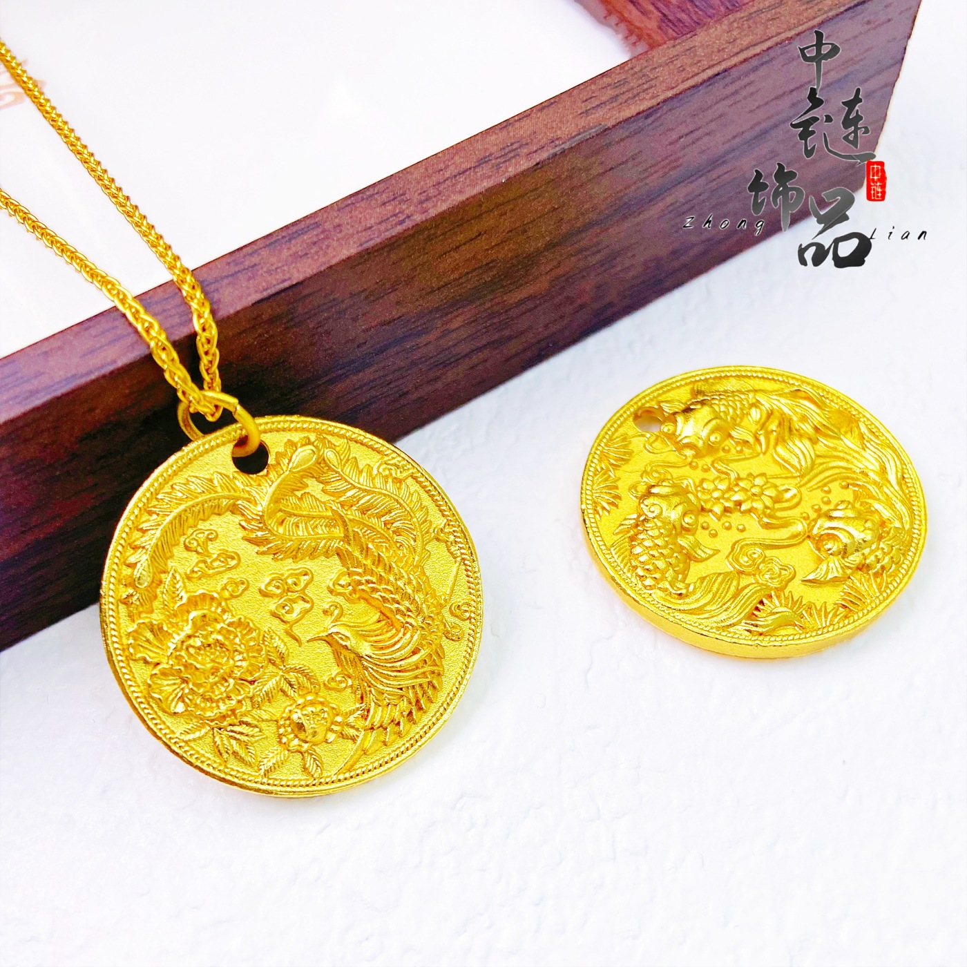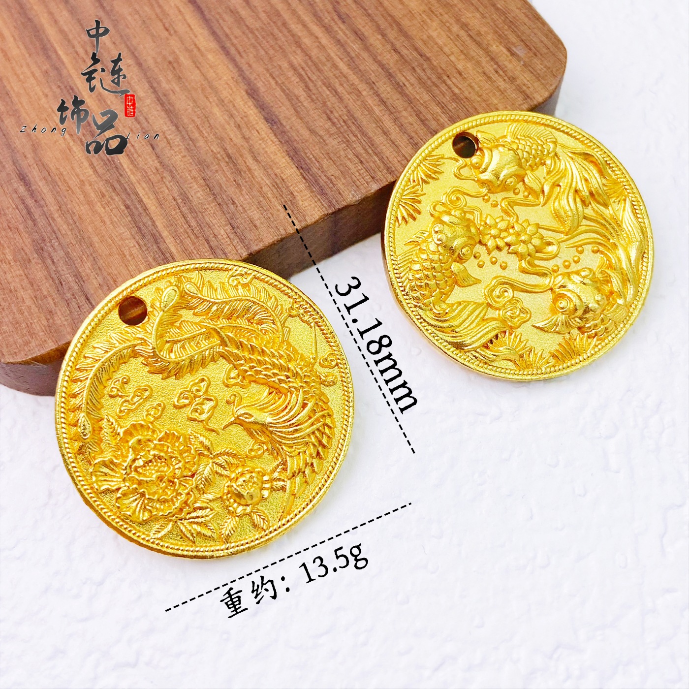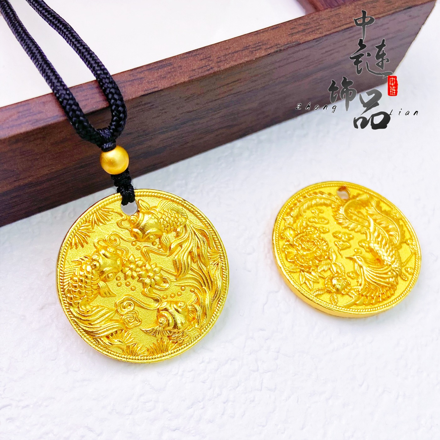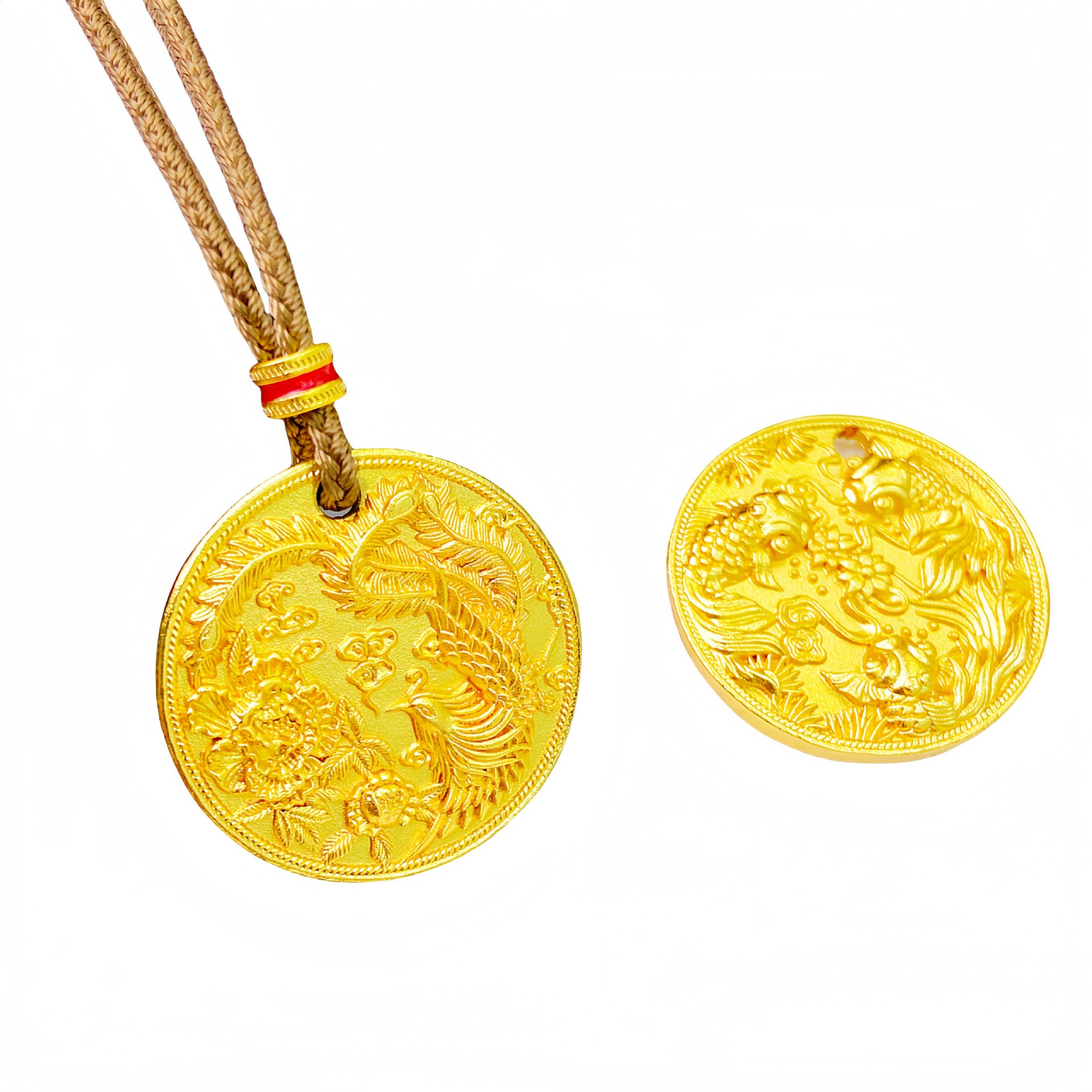 金店同款古法沙金凤凰于飞牡丹花圆盘吊坠新中式国风锦鲤戏水挂坠 - 花漾物语工坊