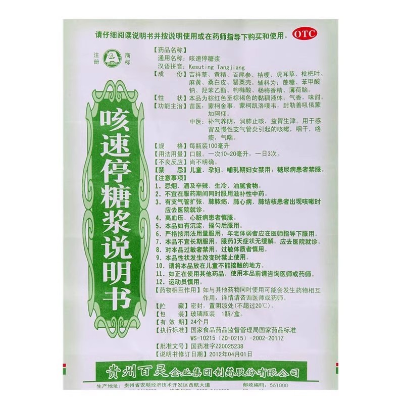 百灵 咳速停糖浆100ml感冒慢性支气管炎咳嗽咽干咯痰气喘润肺止咳 - 众利群大药房旗舰店