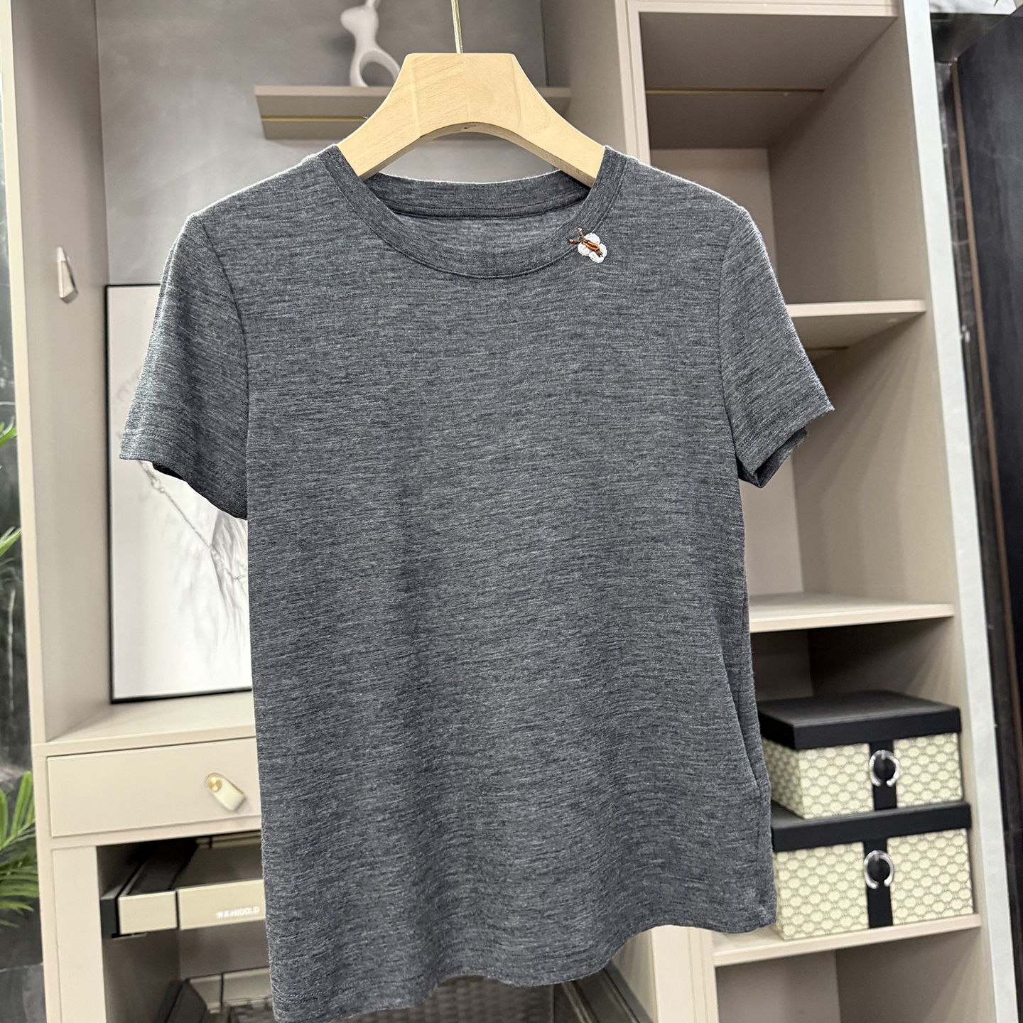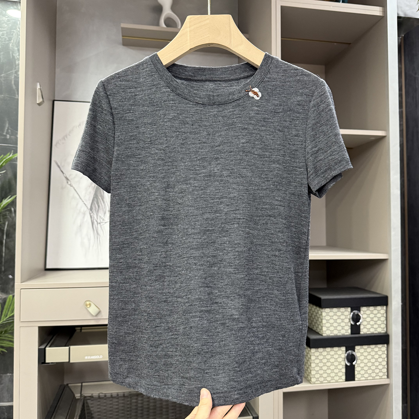 咆哮推荐!wu敌好穿!薄款正肩羊毛圆领短袖针织T恤女  168338~ZY