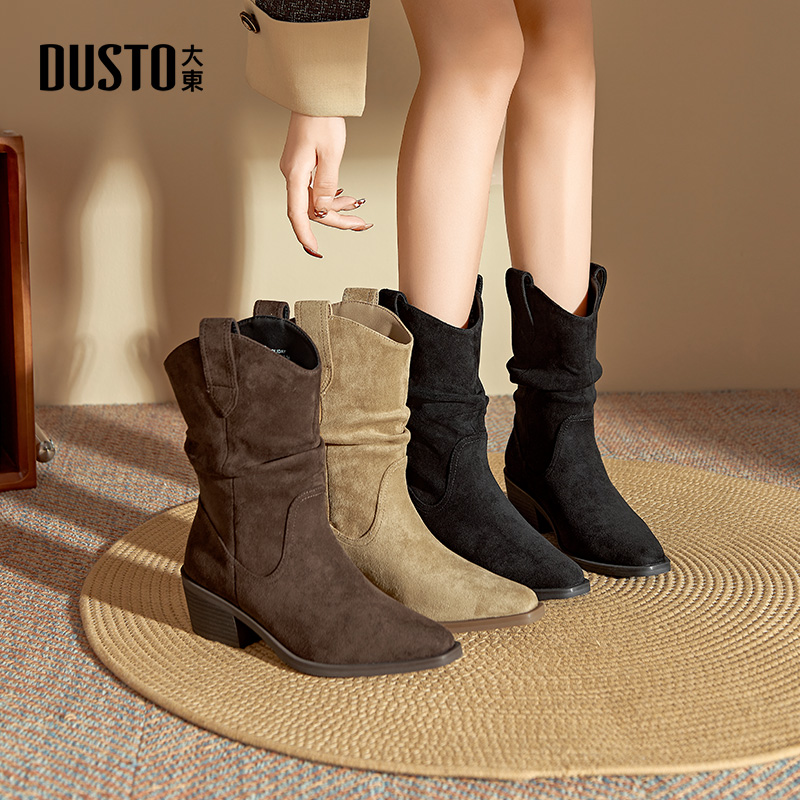 大东女靴短靴2025冬季新款美拉德方头中筒靴子绒面复古粗跟瘦瘦靴 - DUSTO大东时尚旗舰店