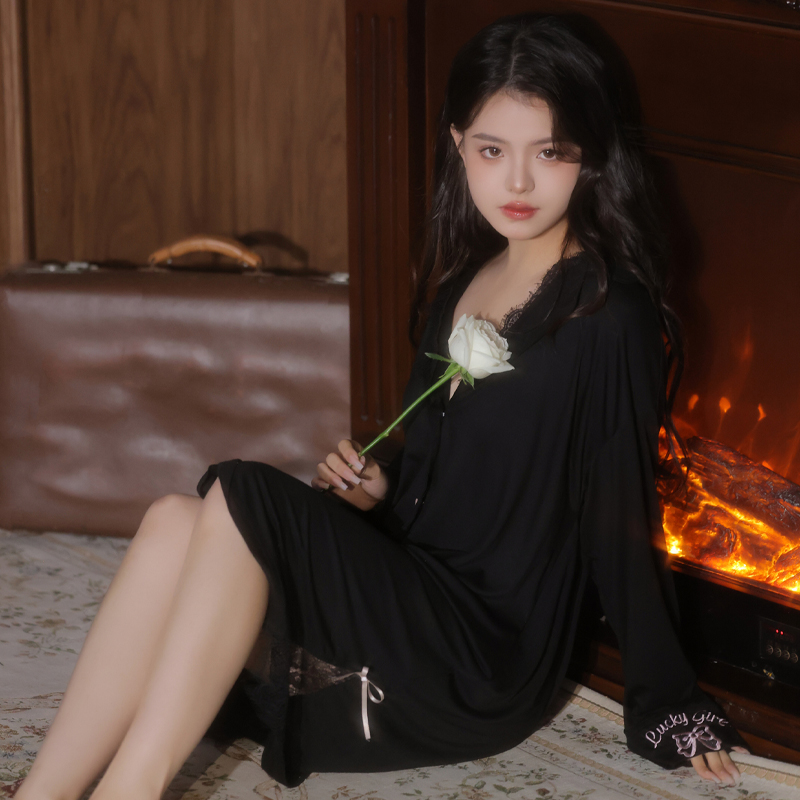 2025年新款短款纯欲风短裙长袖睡裙女款黑色莫代尔睡衣女大码性感 - Aurora 原创设计家居服