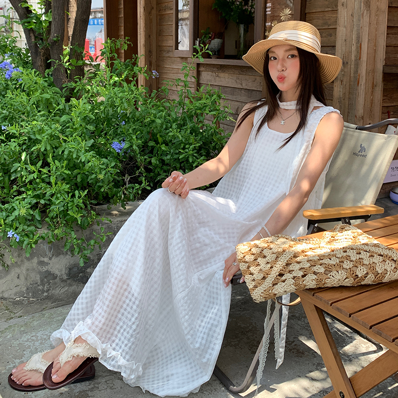 【吴优推荐】KRO宽松搭配飘带设计U型领显瘦长款格子背心连衣裙
