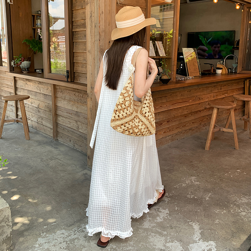 您的位置:他他商城  >   >  【吴优推荐】KRO宽松搭配飘带设计U型领显瘦长款格子背心连衣裙