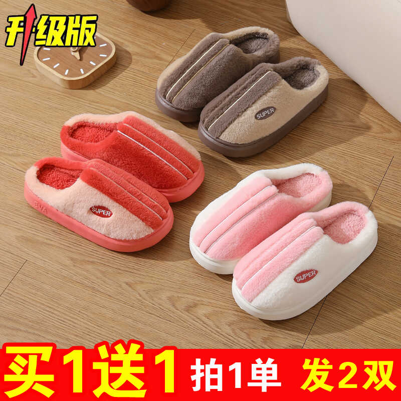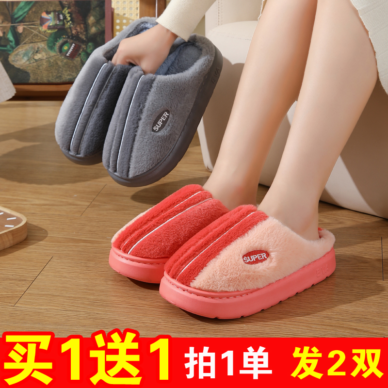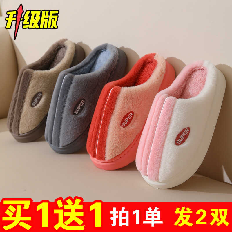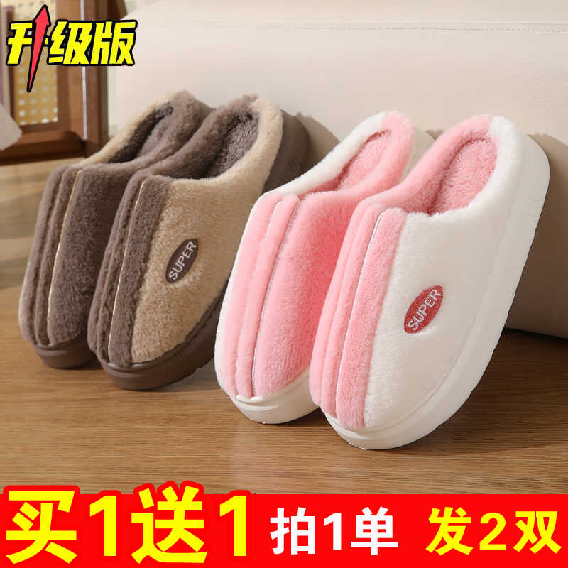 买一送一棉拖鞋女士冬季情侣室内居家用加绒保暖防滑厚底毛拖鞋男 - 团购批发精品室内居家鞋