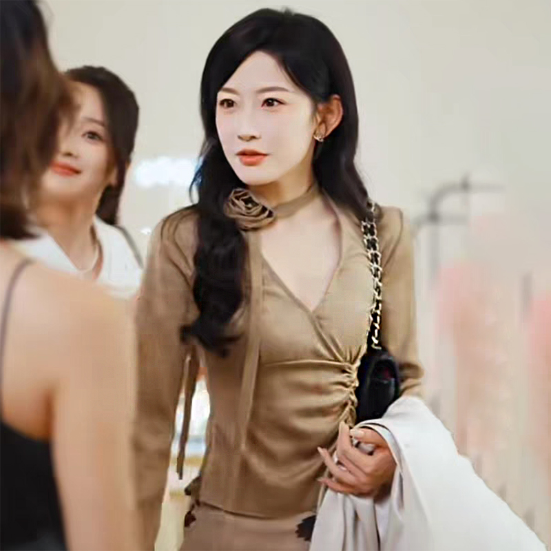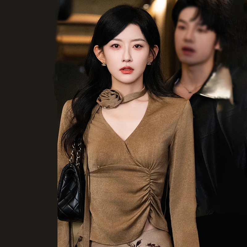 您的位置:他他商城  >   >  韩雨彤同款设计感飘带V领衬衫女秋季新款高级感气质短款长袖上衣