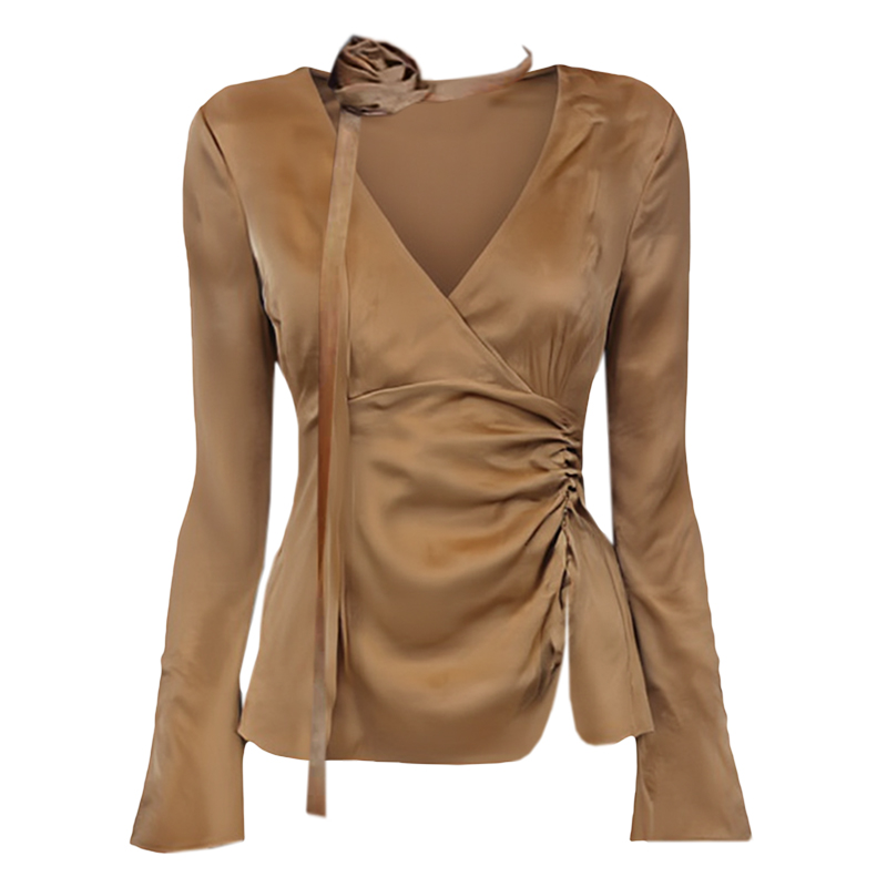 韩雨彤同款设计感飘带V领衬衫女秋季新款高级感气质短款长袖上衣 - Chic Ladies