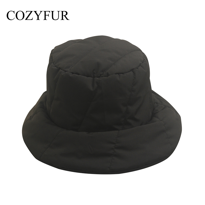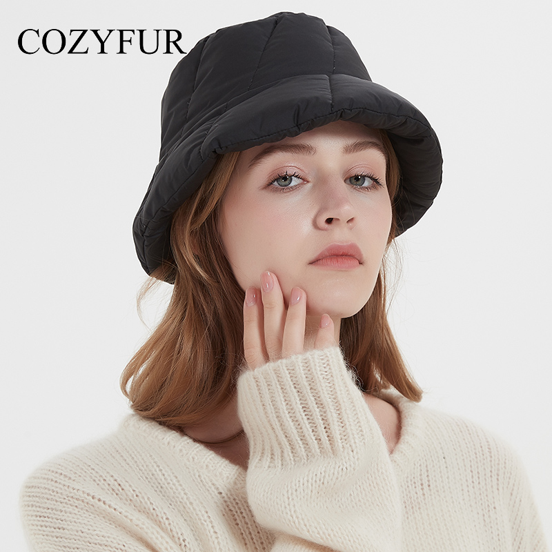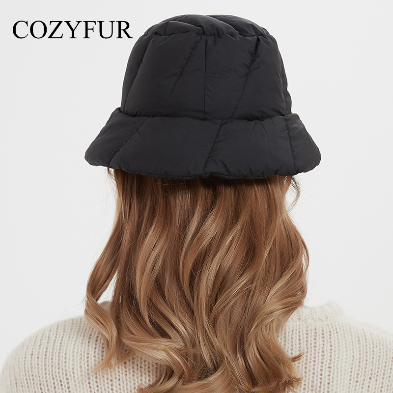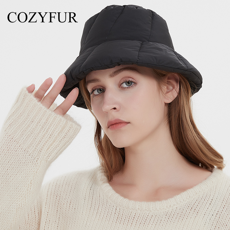 Cozyfur 渔夫帽女冬季丝绵加厚羽绒布盆帽韩版百搭帽子黑色潮酷 - cozyfur旗舰店