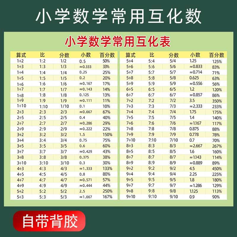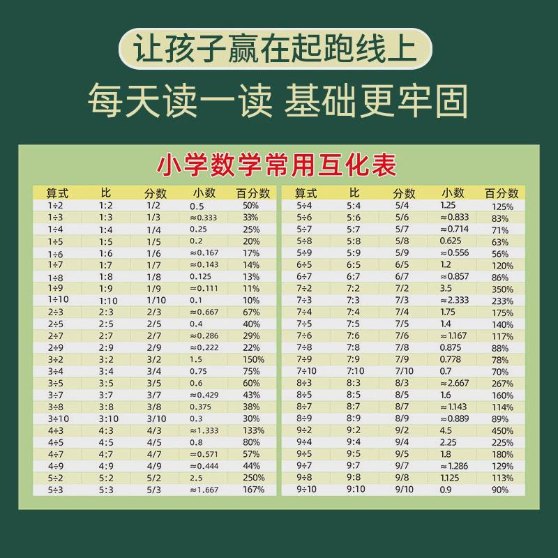 小学数学常用小数分数互化t表百分比几分之几百分数T换算式平方数 - 盛隆园日用品