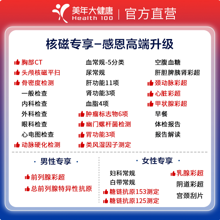 您的位置:他他商城  >   >  美年大健康核磁专享感恩高端升级体检套餐中老年父母全身体检套餐