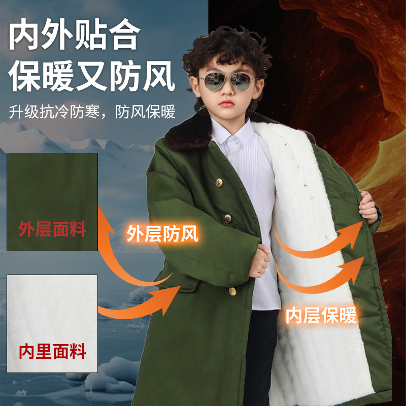 儿童军大衣男童冬季加厚保暖棉服防寒小学生女孩长款东北绿色棉袄