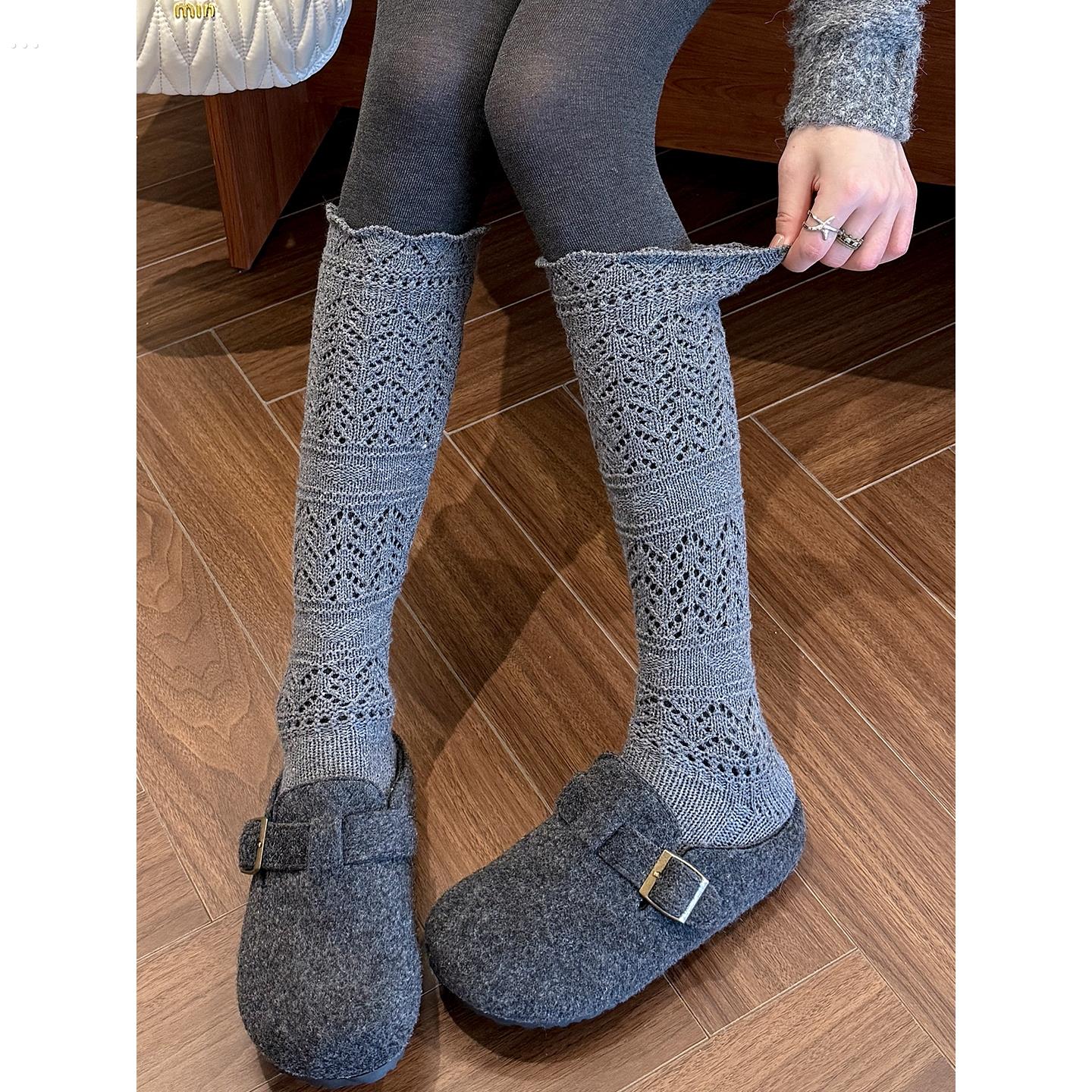 覆古灰色镂空花纹针织羊毛小腿袜春秋韩系潮款穿搭堆堆花边长筒袜 - 十月一喝酒的小店