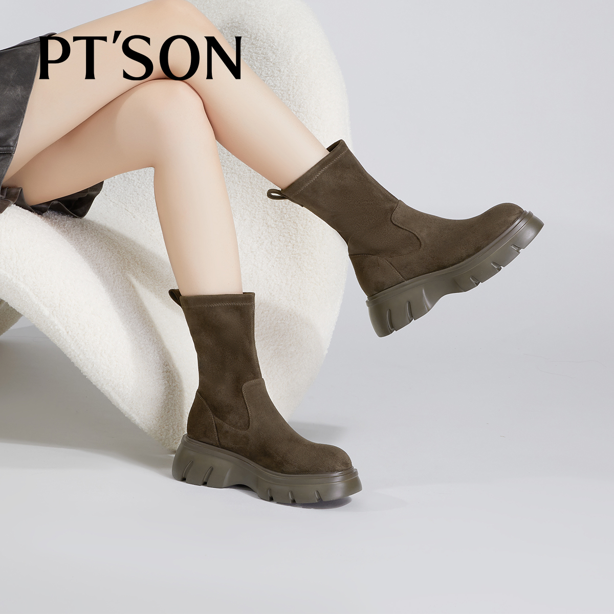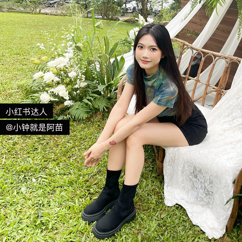 粉粉同款百田森英伦风袜靴女秋季新款袜子鞋绒面厚底短靴弹力靴子 - 百田森旗舰店