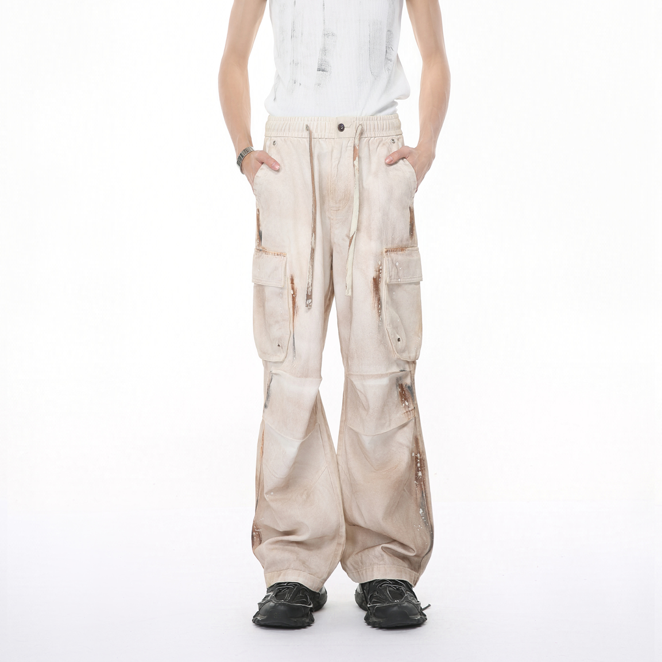 您的位置:他他商城  >   >  Voguo Relay 复古泼墨涂鸦做旧工装休闲裤松紧腰褶皱宽松直筒裤