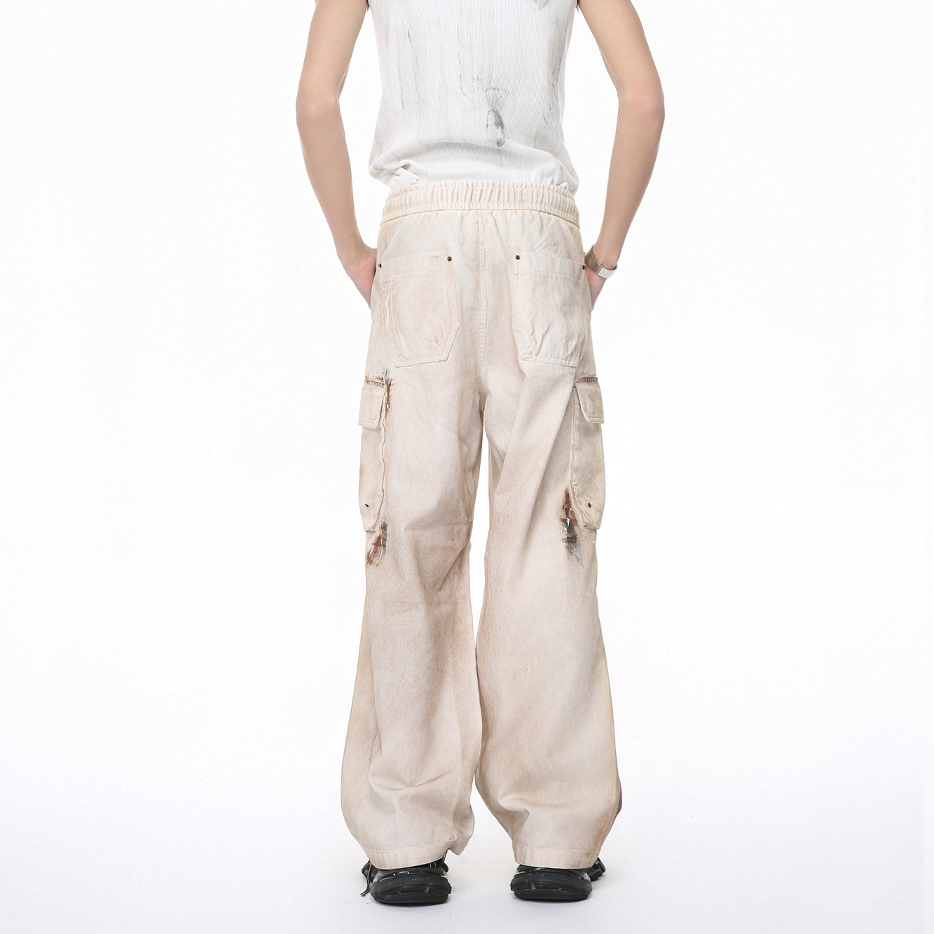 Voguo Relay 复古泼墨涂鸦做旧工装休闲裤松紧腰褶皱宽松直筒裤