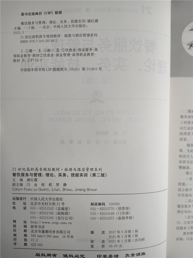 餐饮服务与管理:理论、实务、技能实训(第二版) 旅游与酒店管理系列 中国人民大学出版社9787300287461 - 智远景辉图书专营