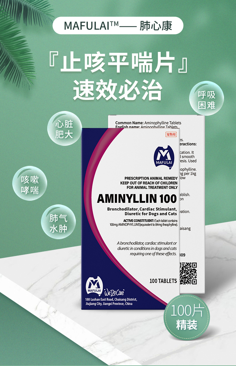 MAFULAI肺心康100mg宠物氨茶碱片狗狗猫咪咳喘支气管炎心脏肥大药