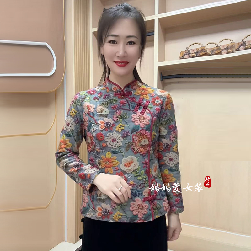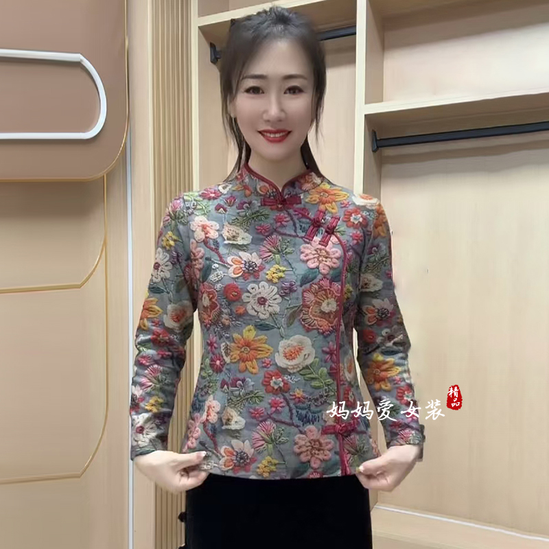 冬季加绒加厚保暖衬衫中老年洋气妈妈弹力复古盘扣旗袍上衣小花衫 - 妈妈爱 经典工厂店