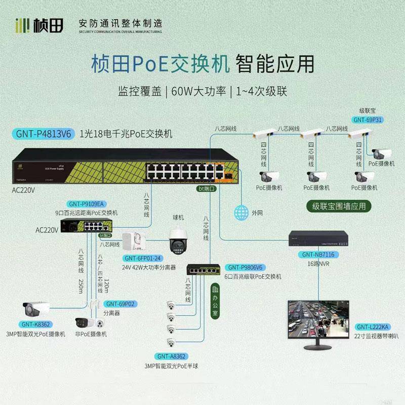 桢田级联宝69P31串联3口POE交换机国标标准POE一分二一分四中继器