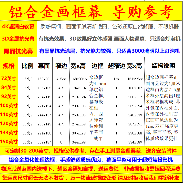 4K超高清3D金属抗光幕布投影家用抗光画框幕布100寸120寸150寸投影幕布画框式幕布投影仪画框幕布投影屏幕布