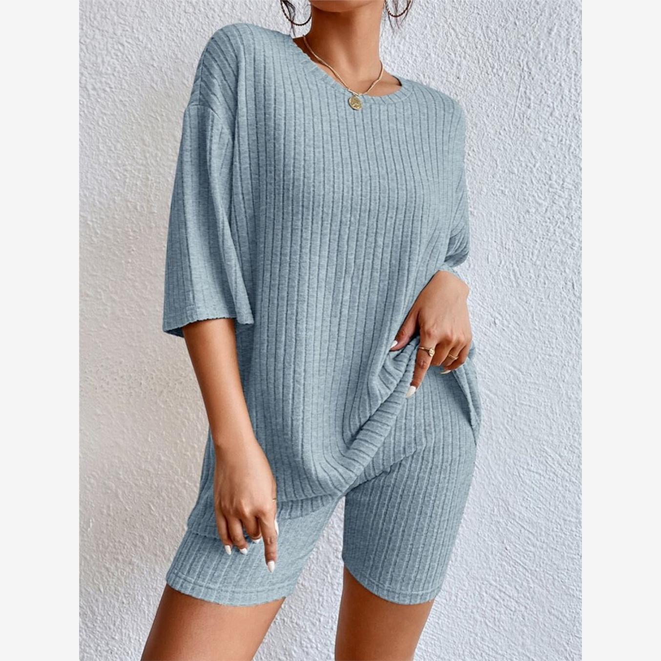 欧美2023时尚休闲纯色圆领宽松女短裤套装Casual solid color set - 年轻最快乐18
