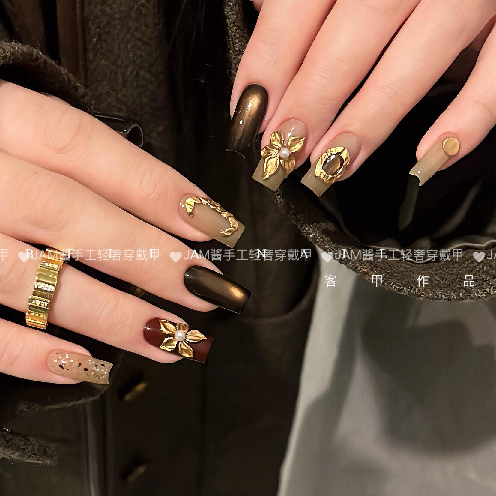 木槿 新款纯手工穿戴甲中长款复古手雕花猫眼穿戴美甲高级感显白 - JAM酱手工轻奢穿戴甲