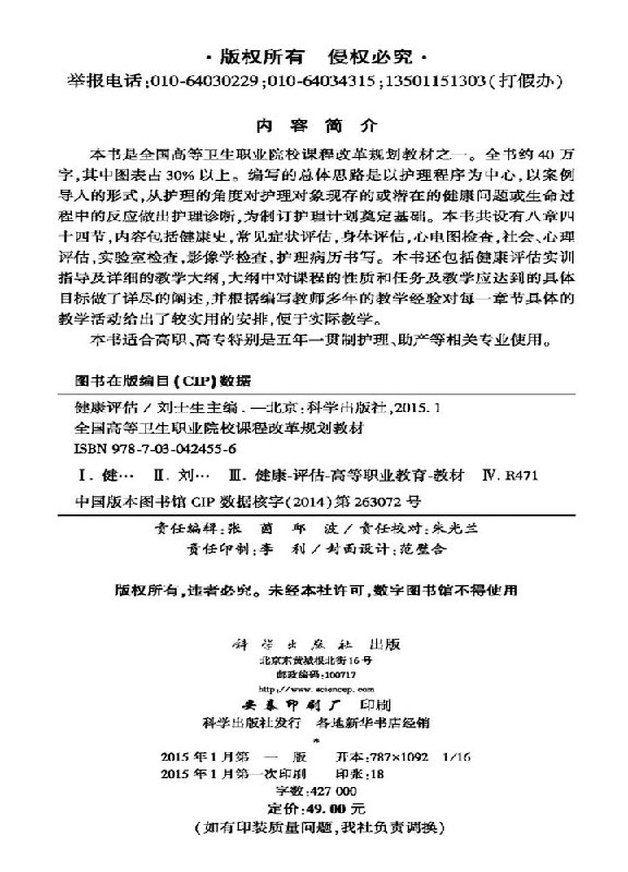 健康评估(五年制高职考点版)全国高等卫生职业院校课程改革规划教材 刘士生著 科学出版社 9787030424556
