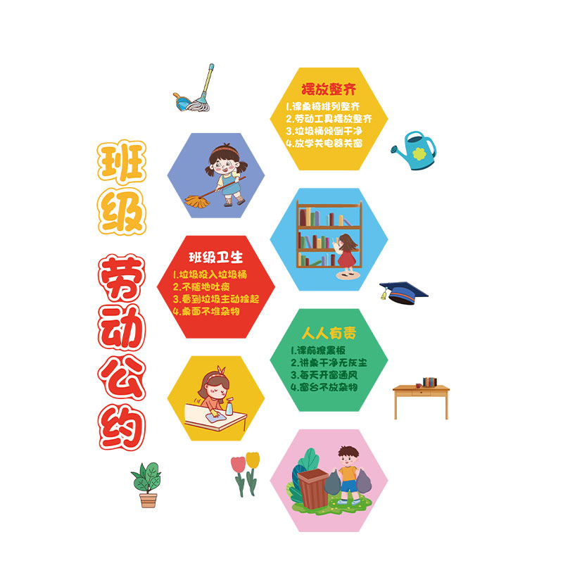 您的位置:他他商城  >  居家  >  劳动公约文化墙贴纸面卫生角班级布置教室装饰成品氛围幼儿园环创