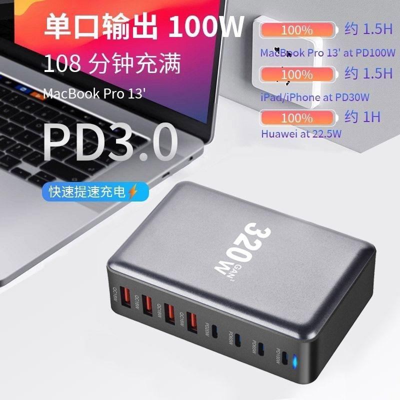 氮化镓充电器多口usb快充PD100W大功率桌面充电站多孔闪充坞适用华为苹果手机笔记本通用英欧澳美规插座 - 百启数码旗舰店
