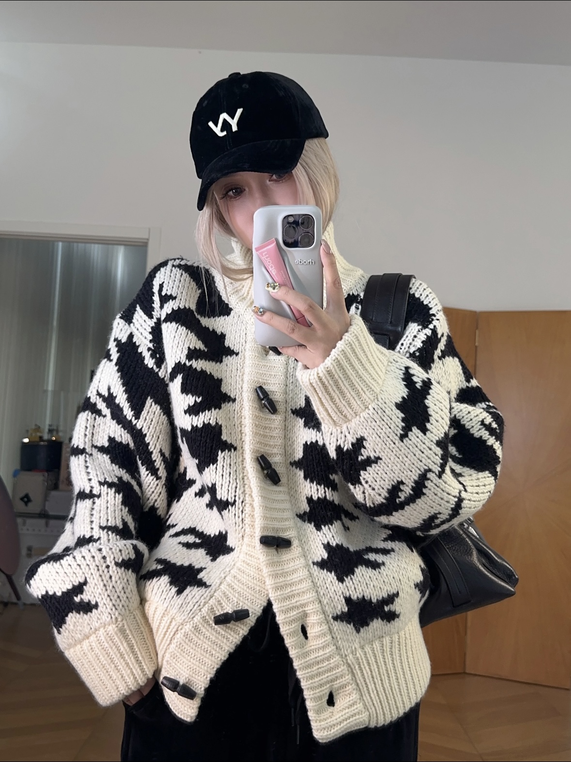 正确版!TINA OPEN YY25秋冬重磅千鸟格毛衣外套开衫 加厚 - BlackLabel