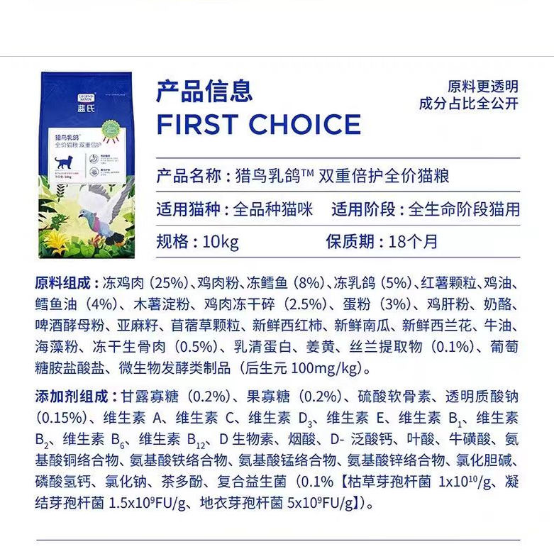 蓝氏猫粮正品10KG全价猎鸟乳鸽猫粮冻干生骨肉通用猫粮 - 珊珊宠物食品用品店