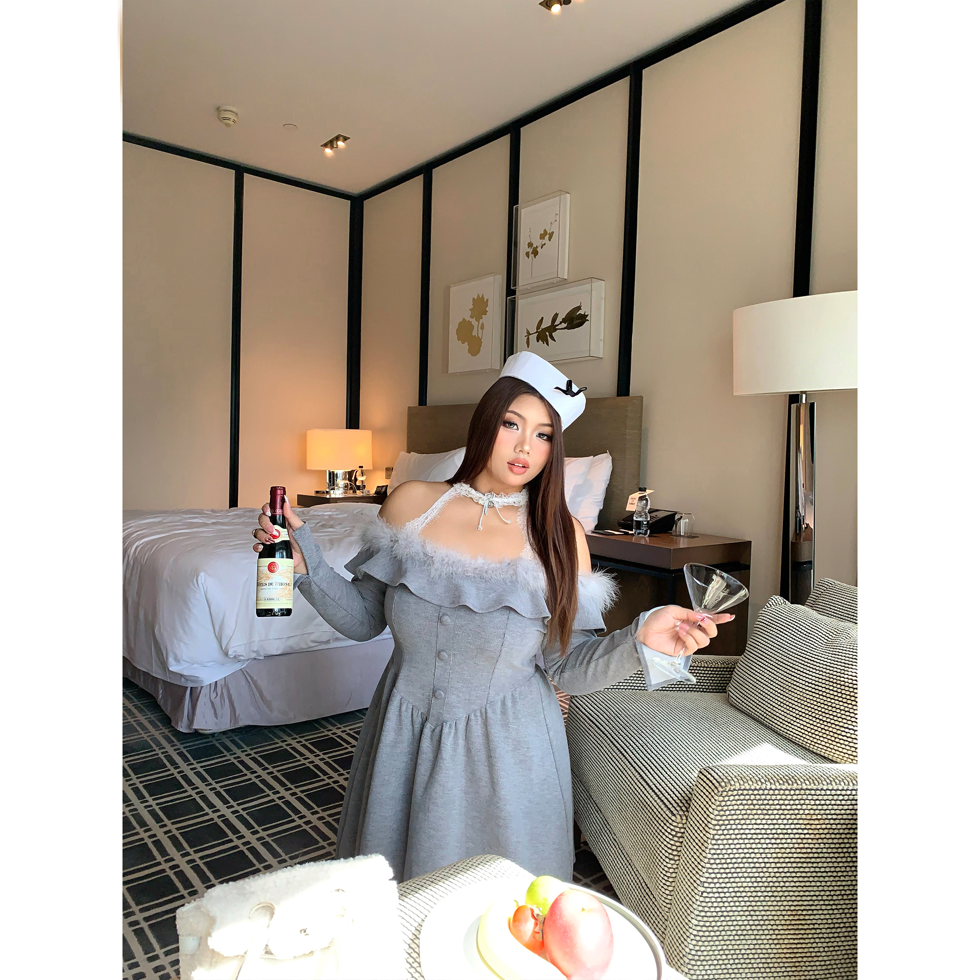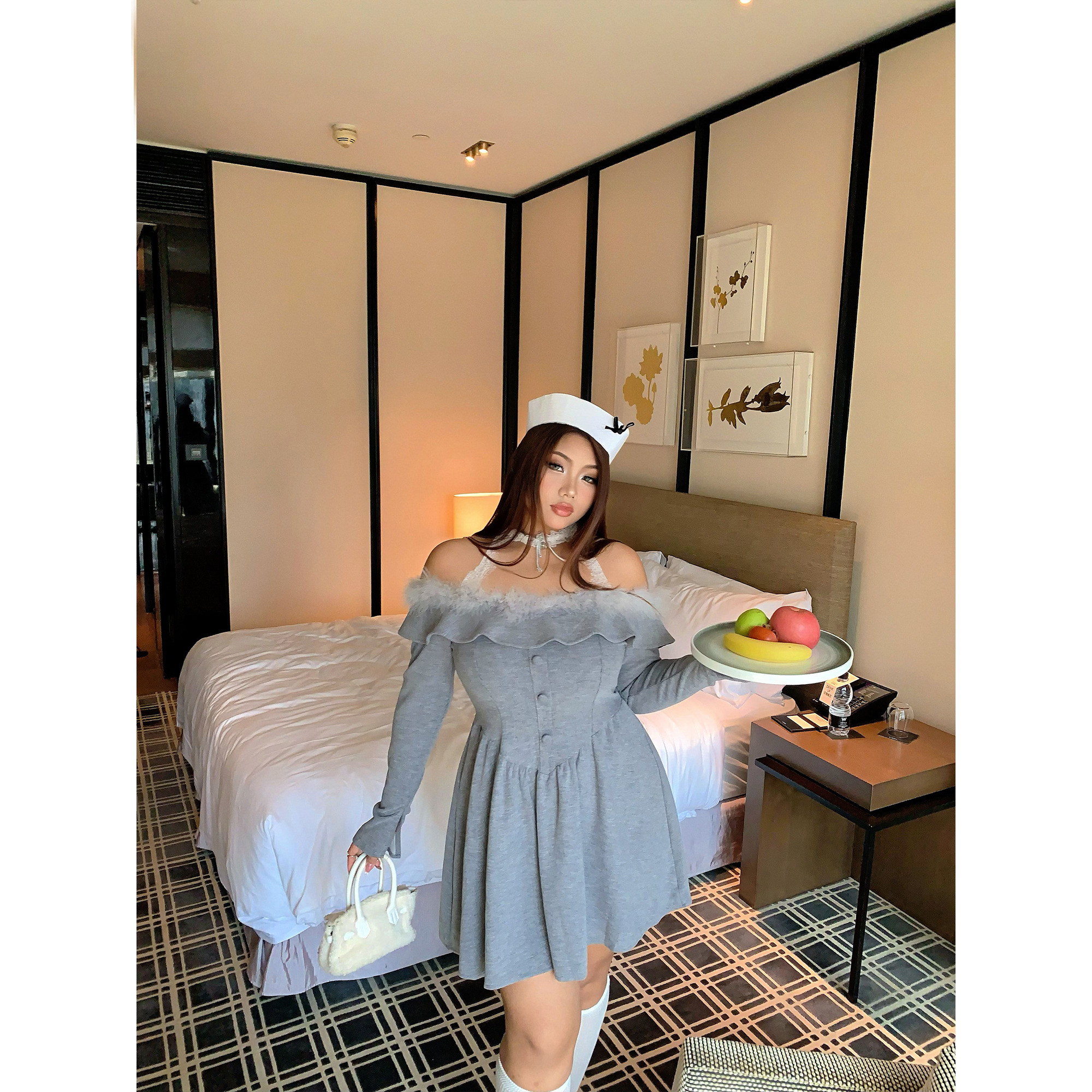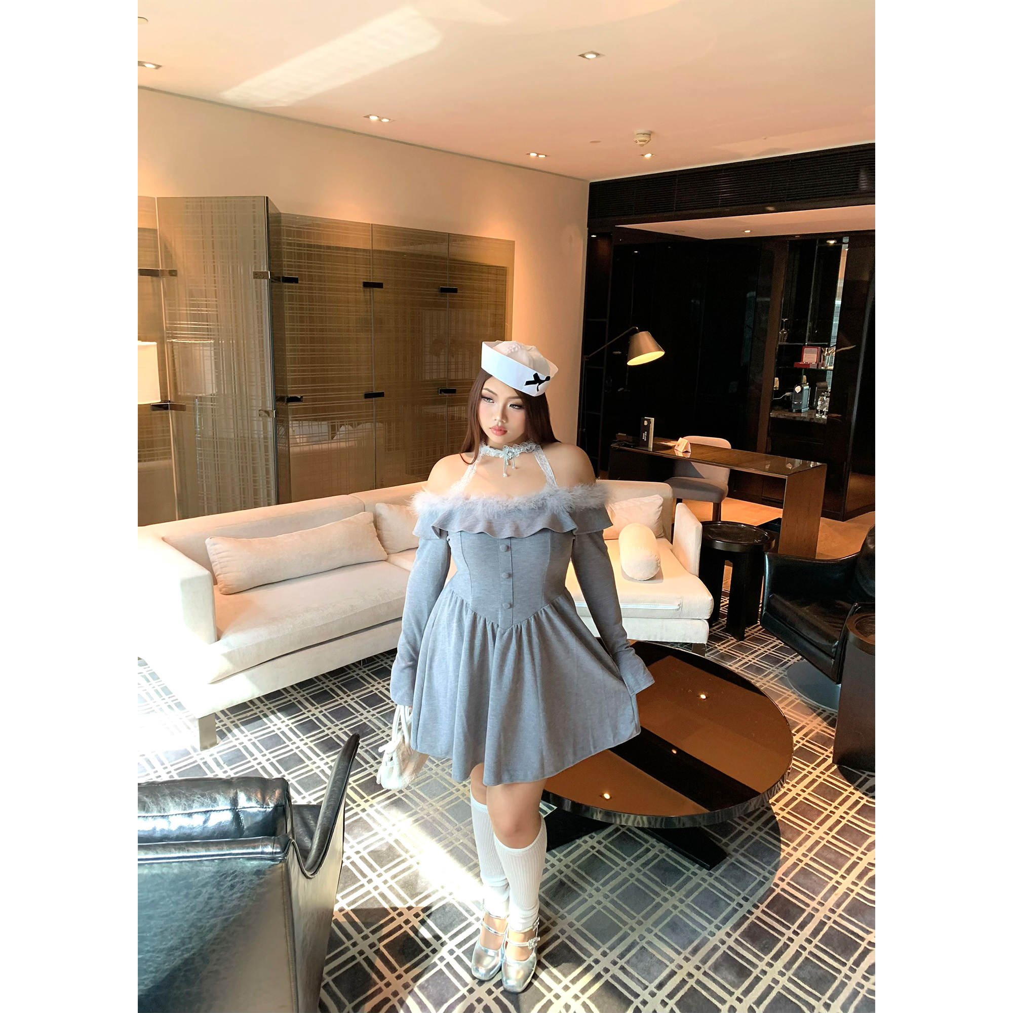 楠哥微胖mm辣妹纯欲毛毛领一字肩连衣裙女秋冬大码甜酷收腰A字裙 - 楠哥你好微胖定制