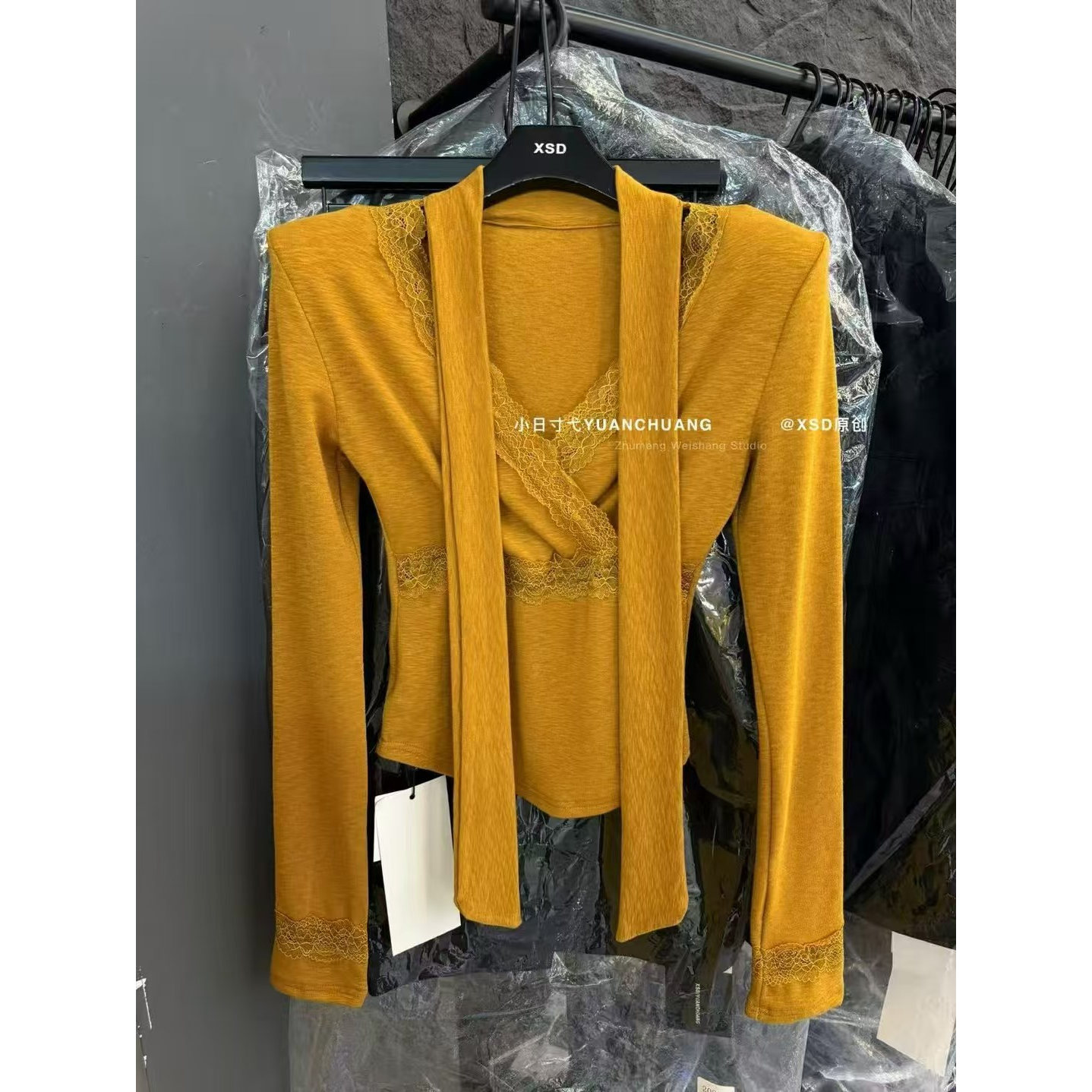 韩系V领心机辣妹性感系带设计感褶皱收腰显瘦百搭时髦加绒上衣女 - 韩米米小姐