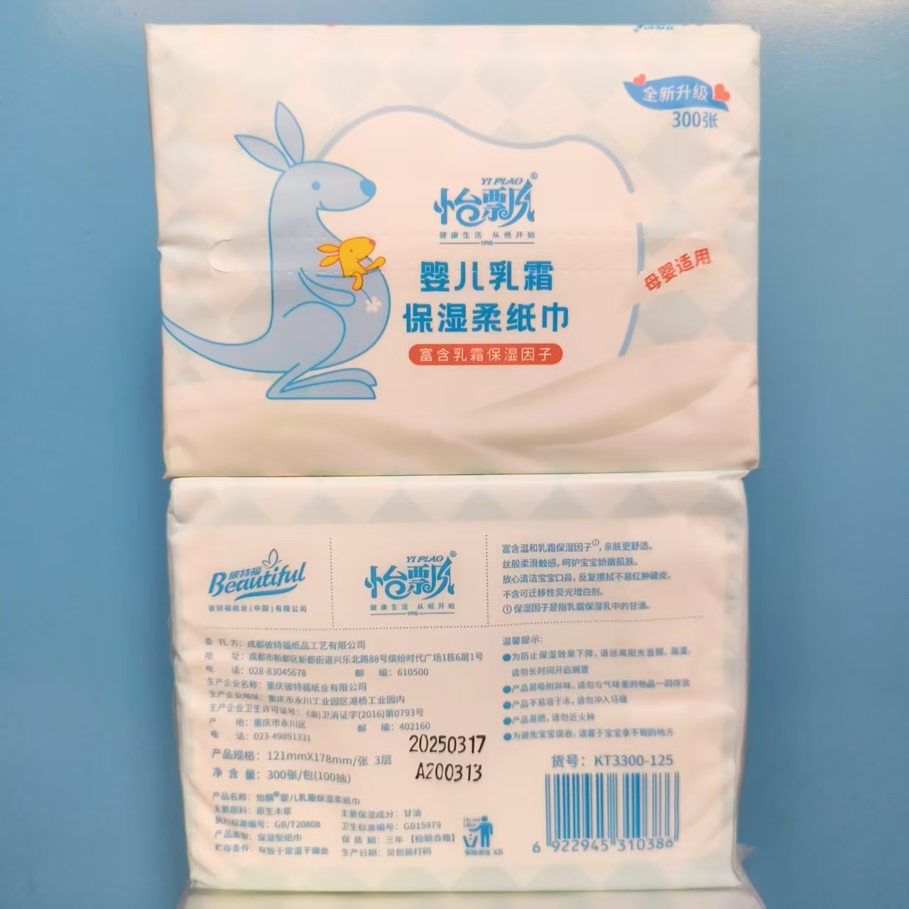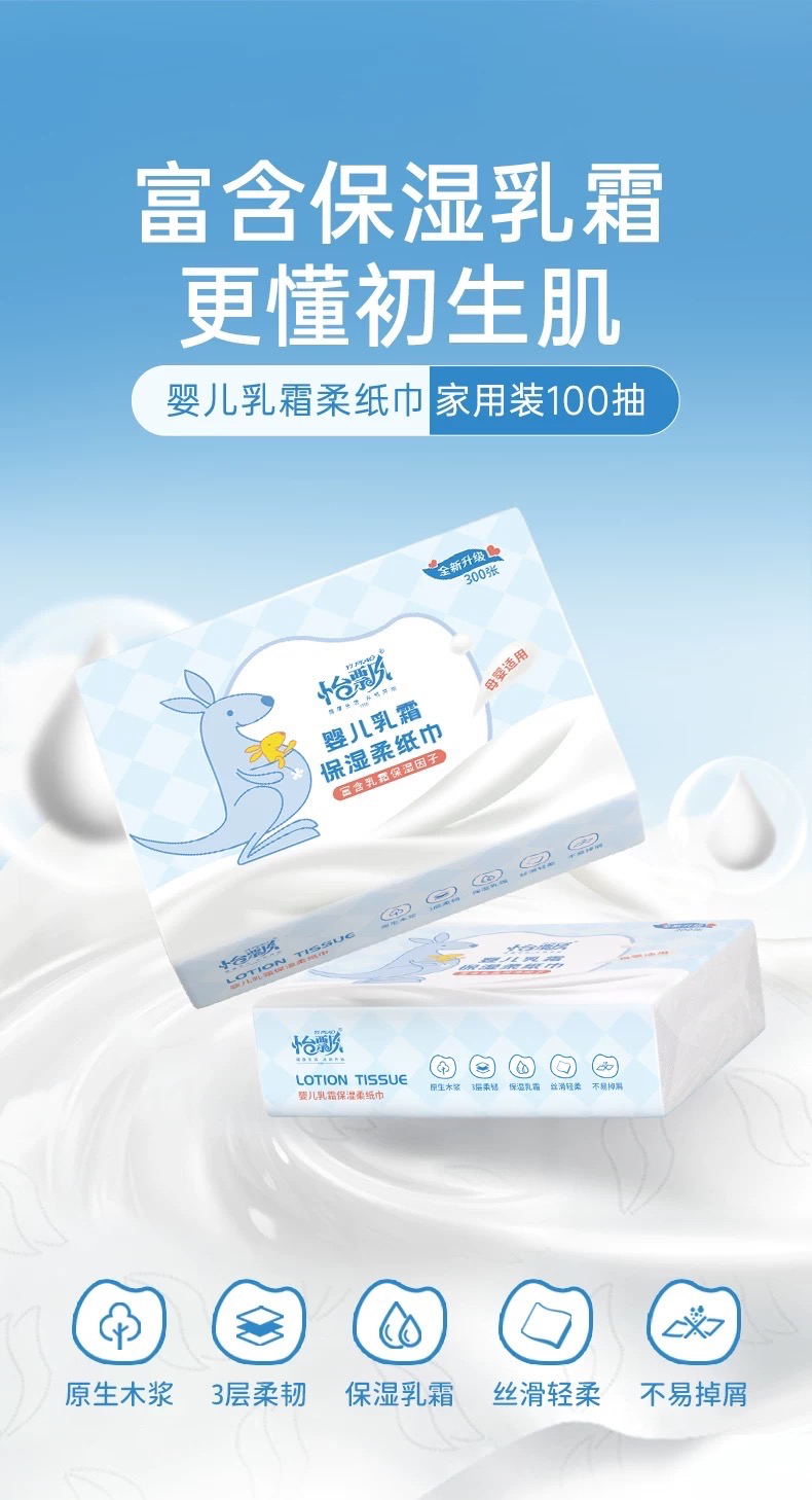 怡飘乳霜柔纸巾100抽新生婴儿专用保湿云柔巾擦鼻涕超柔亲肤 - 万家纸品